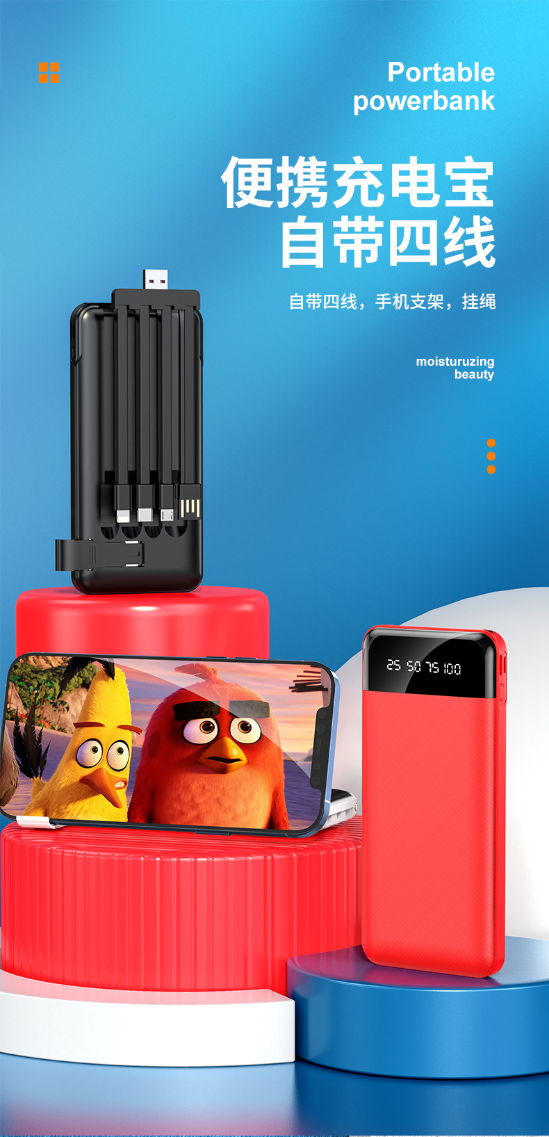 自带四线移动电源迷你轻巧大容量200000毫安礼品充电宝定 制logo