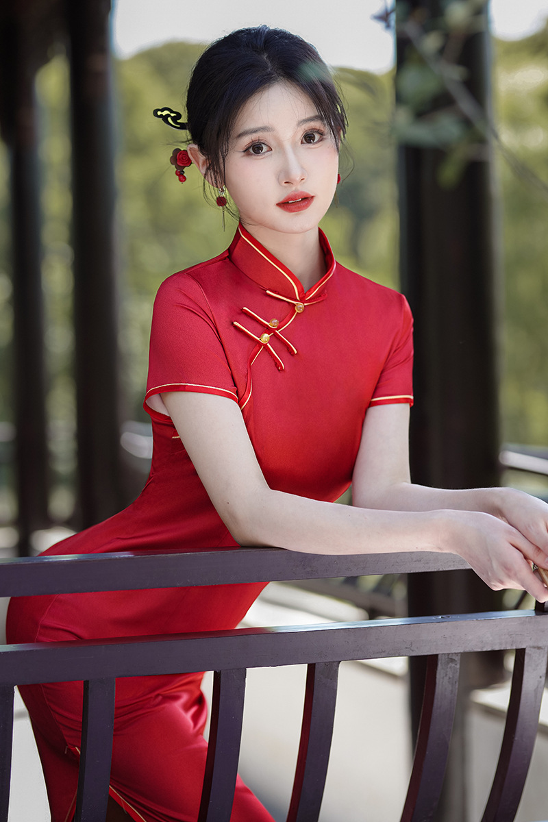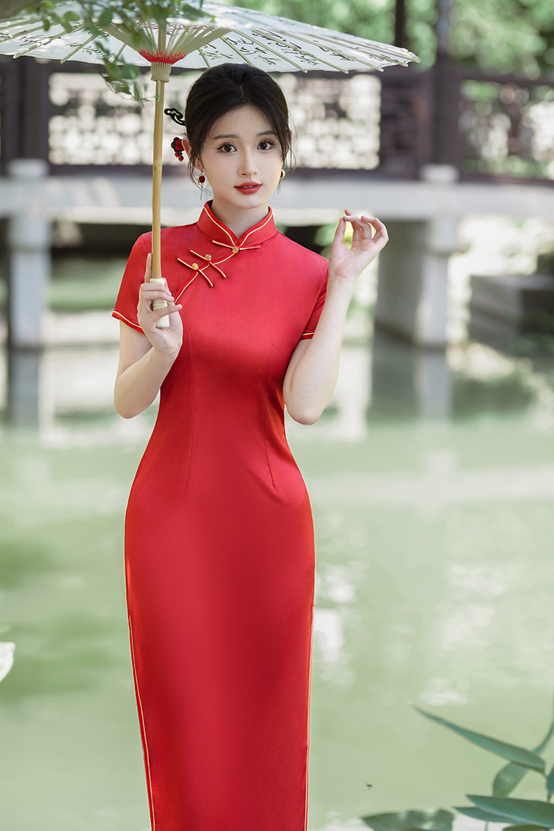 2024赤い春夏の新しいチャイナドレスのロングスカートの気質の中国風の絹織物のワンピースの安い演出服の卸売り
