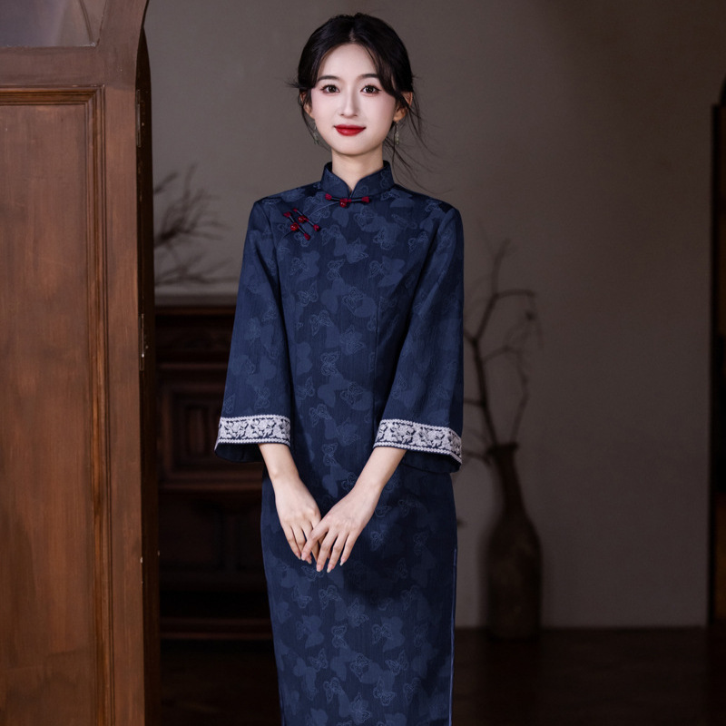 新款2025秋冬国风改良蝴蝶提花面料旗袍倒大袖新中式大码演出批发