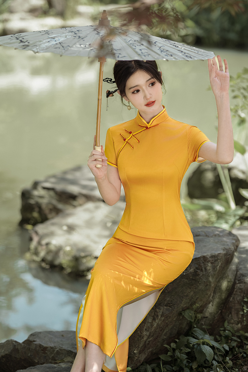 チャイナドレス改良された女性の 2025 春の新作半袖ロングブロケード若い中国風スリムロングスカート卸売