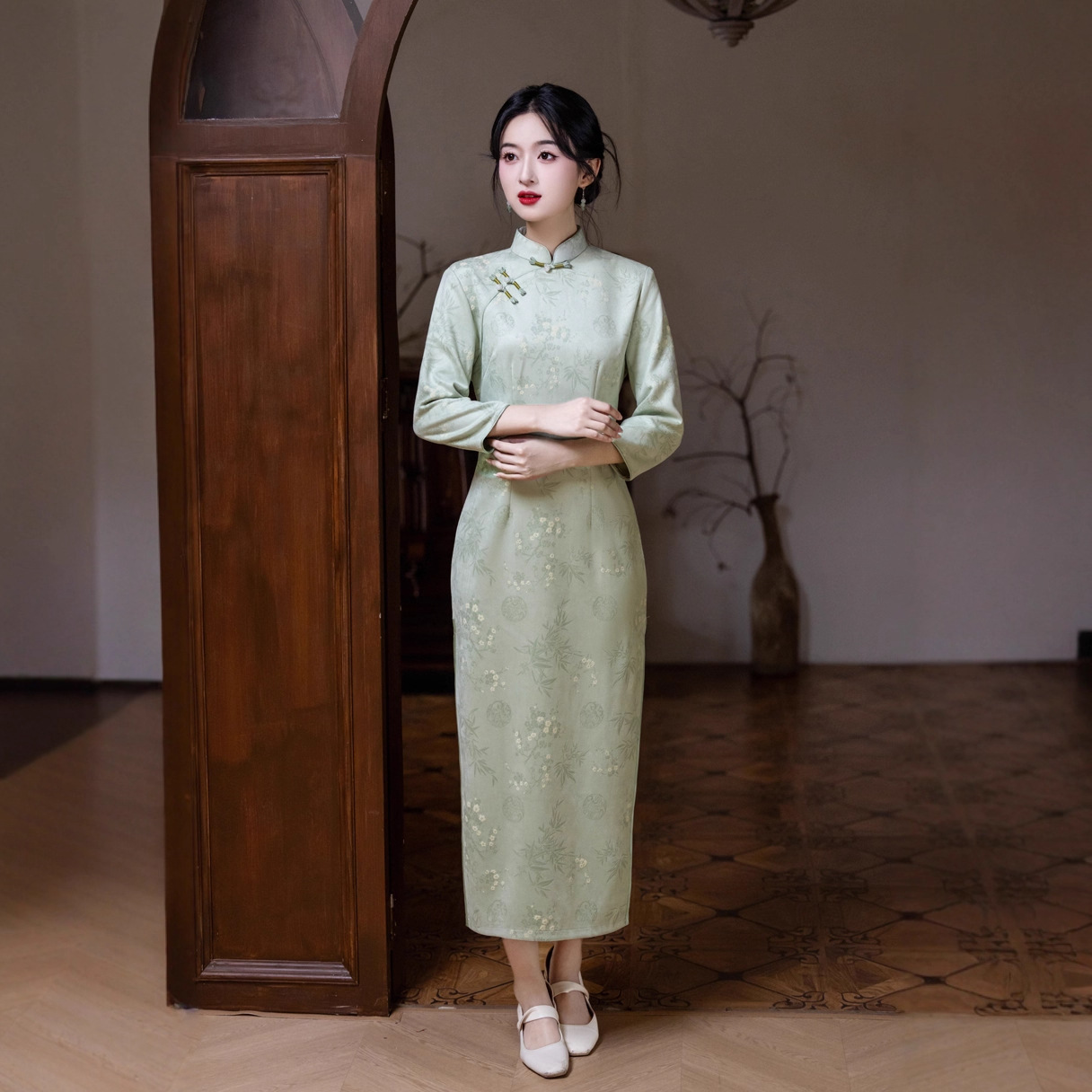 卸売2023秋冬新作のベルベット改良チャイナドレスの大きいサイズの長い九分袖の披露宴のお母さんの公演直売