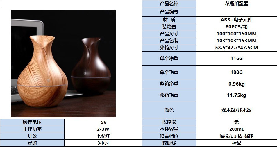 外国貿易の爆発的な家庭用木目花瓶香薫加湿器花瓶加湿器超音波静音七彩加湿器