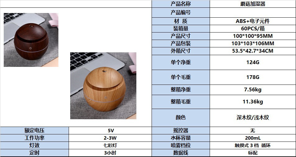 メーカーusbボール七色灯小キノコ加湿器ミニ木目円形透かし彫りアロママシン