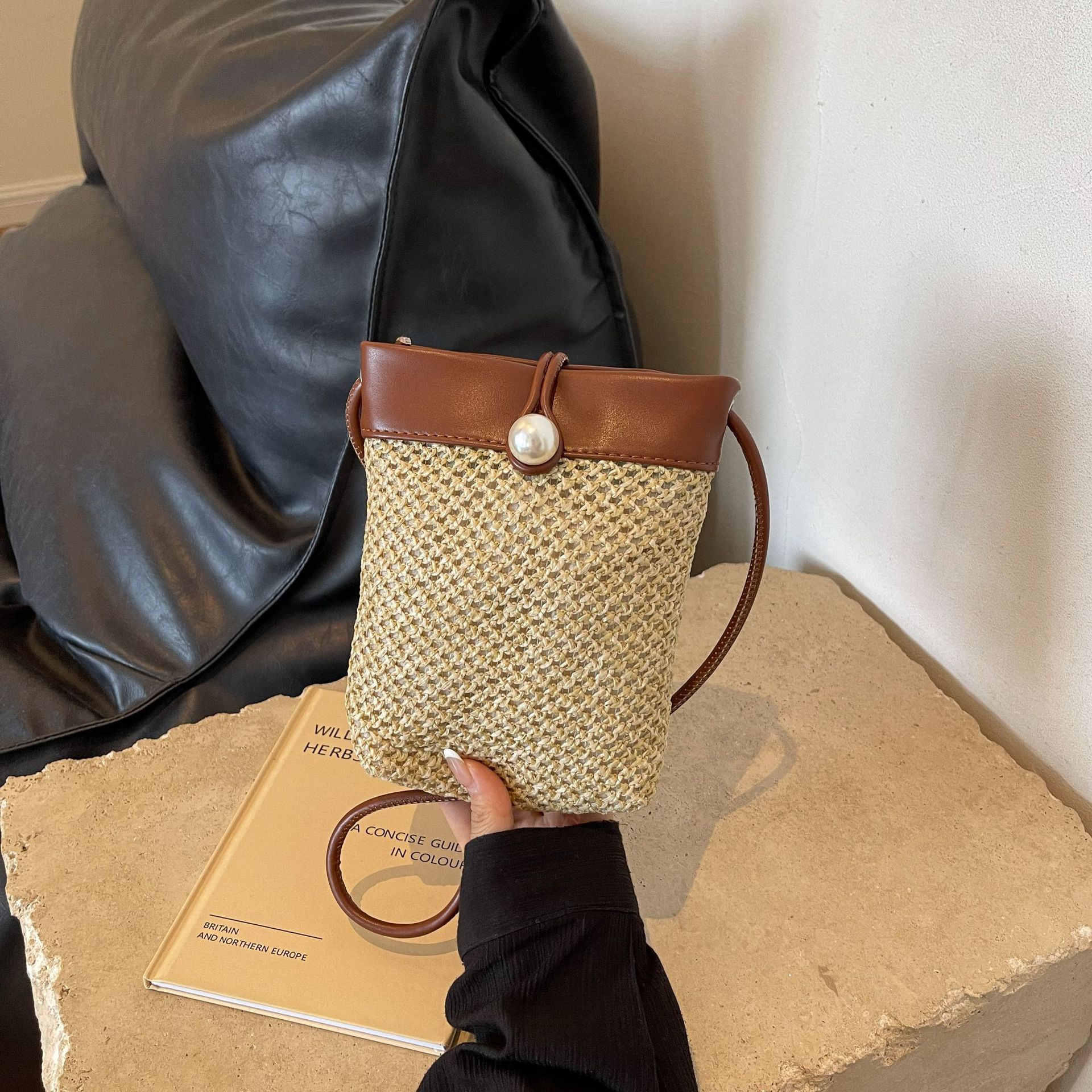 夏の海辺旅行休暇垂直携帯電話バッグ 2025 新しい中空わら織りステッチ pu ショルダークロスボディバッグ