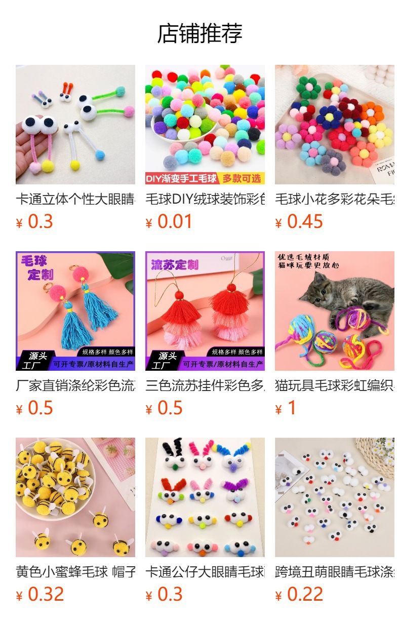 丙纶球毛:1cm,1.5cm,2cm,2.5cm,3cm、3.5cm, 丙纶毛球4cm,4.5cm,5cm、5.5cm(需定做)