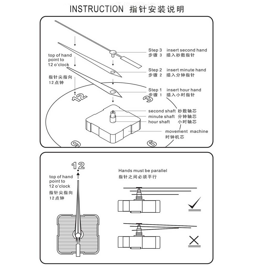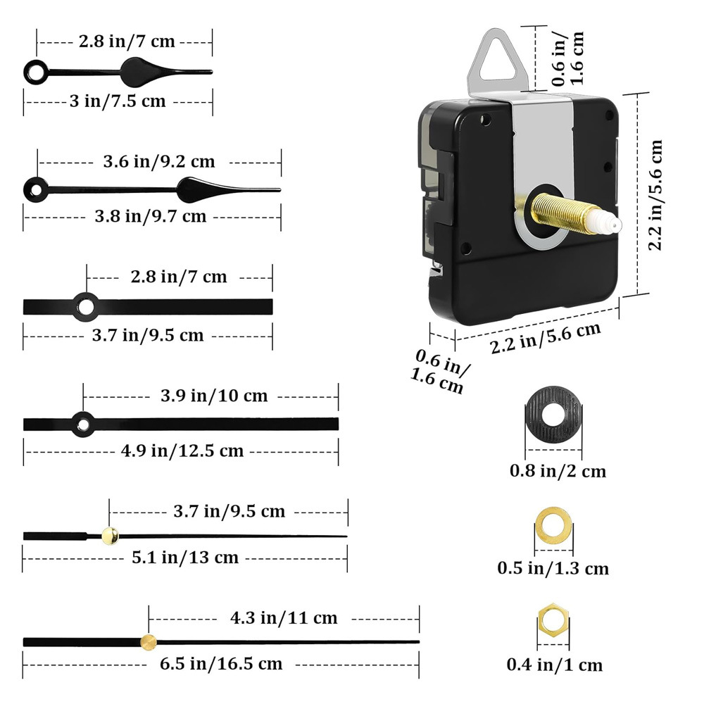 1x机芯,1x金属挂钩,1x橡胶垫,1x华司,1x六角螺母,2x时针,2x分针,2x秒针,1x使用安装说明书