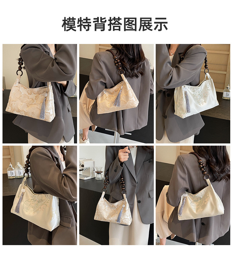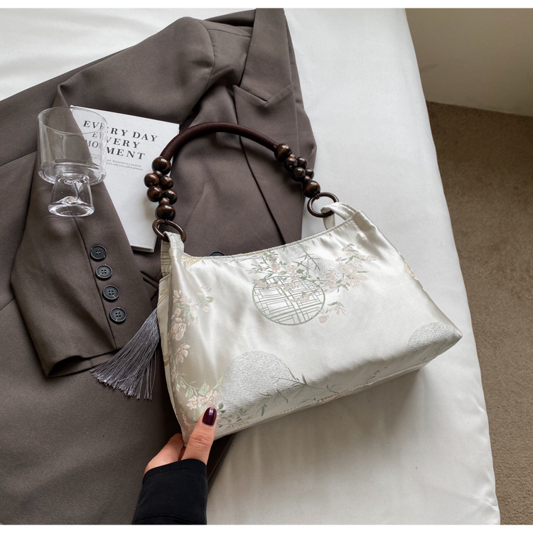 新中式大容量ハンドバッグ、刺繍とビーズをあしらった木製の民族風玉飾り付き、花柄布のショルダートートバッグ、タッセル付き