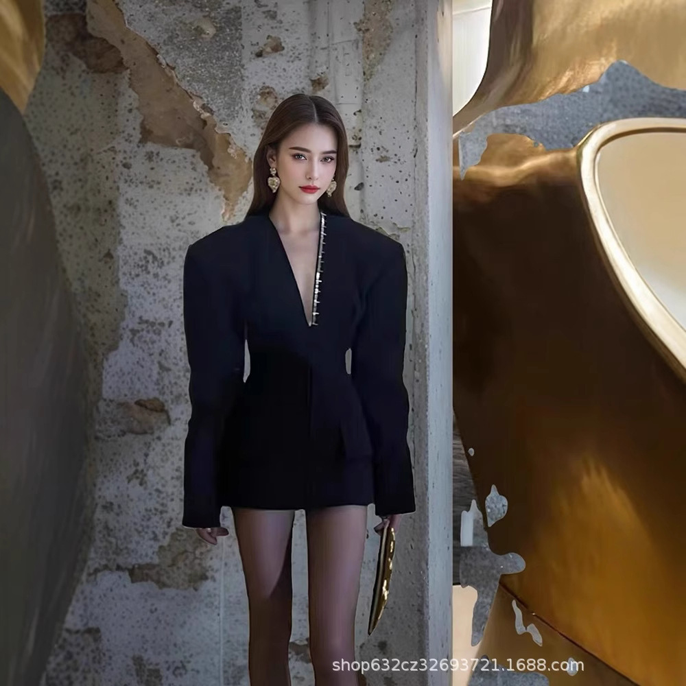 黒ロイヤルシスタースタイルのセクシーな V ネックドレスの女性の 2025 秋の新ハイエンドライト高級気質ホットピーススーツスカート