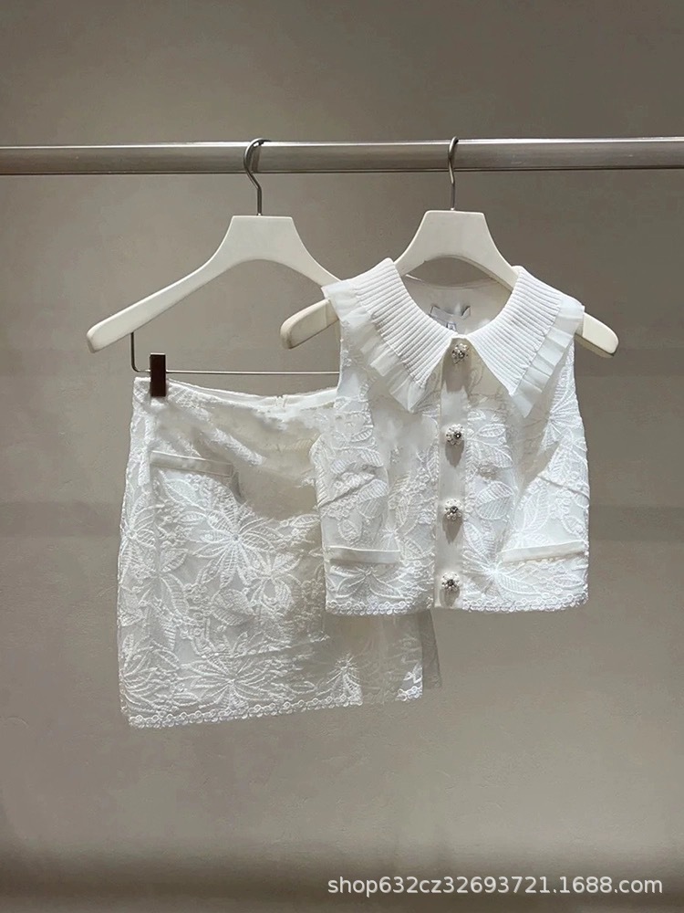 気質の小さい香りの風のフックの花の刺繍のベストの女性の2024夏の高級感の優雅なファッションの半分のスカートの2つのセット