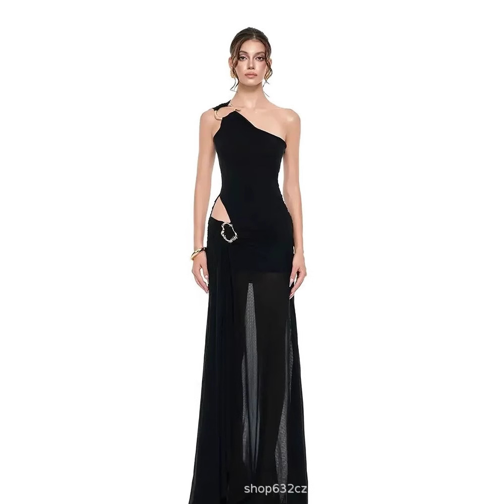 女性のための黒の軽い大人のスタイルの斜め肩ドレス夏のハイエンドの高貴で美しい透視不規則な宴会ドレス
