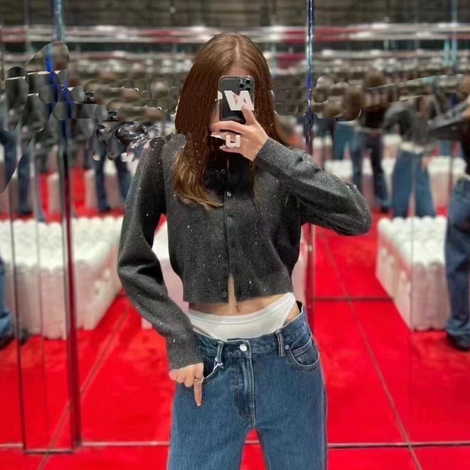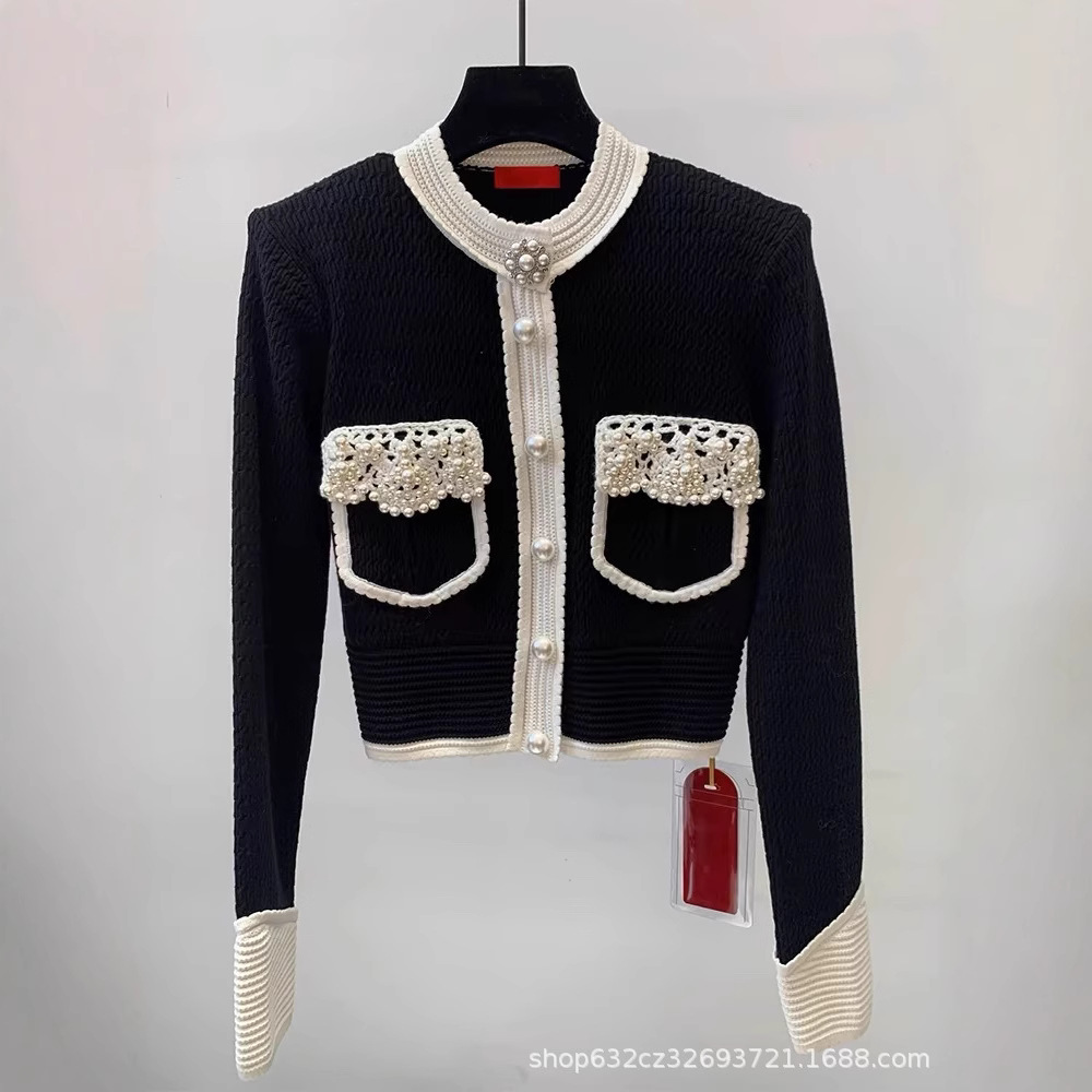 在庫ありブラックの小さなフレグランススタイルの高級ダイヤモンドがちりばめられたニットカーディガン、女性用、2025年秋の新しいスタイル、ニッチなセータートップス