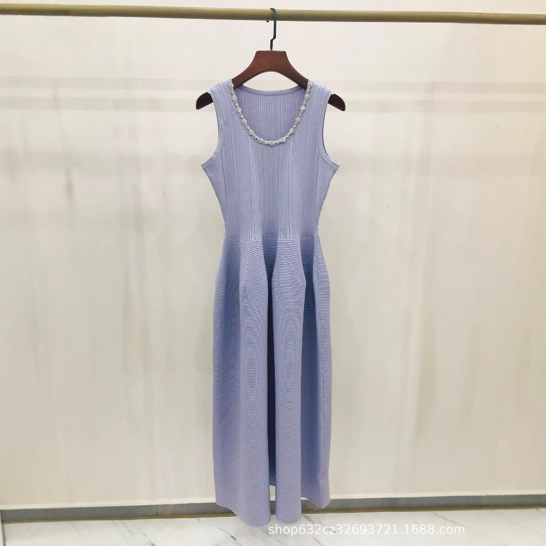紫の絶美の小さいスカートのフランスの釘のドリルのU襟の袖なしの紫色のニットは腰の長いスカートのベストを収めて腰のワンピースを絞めます。