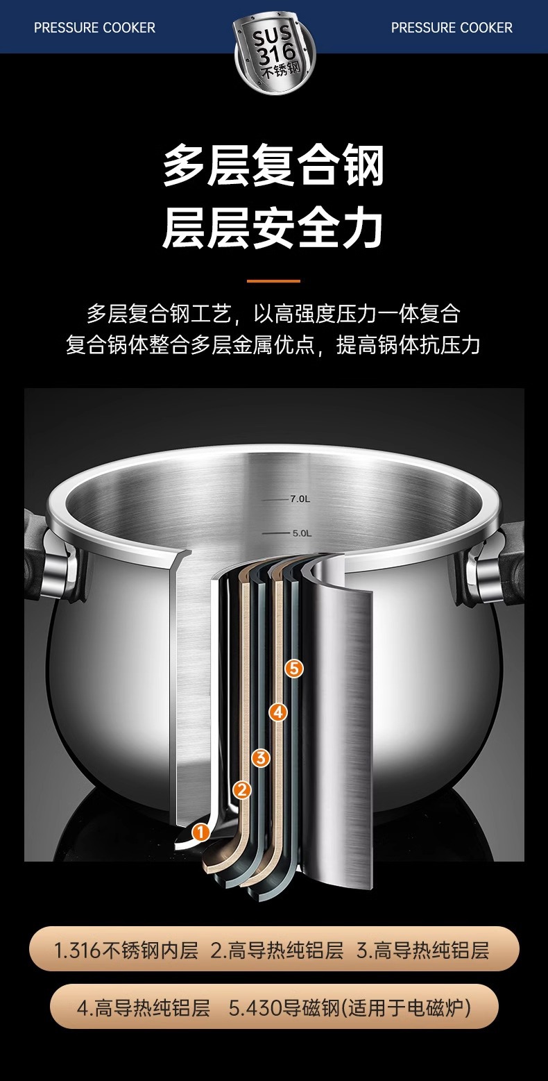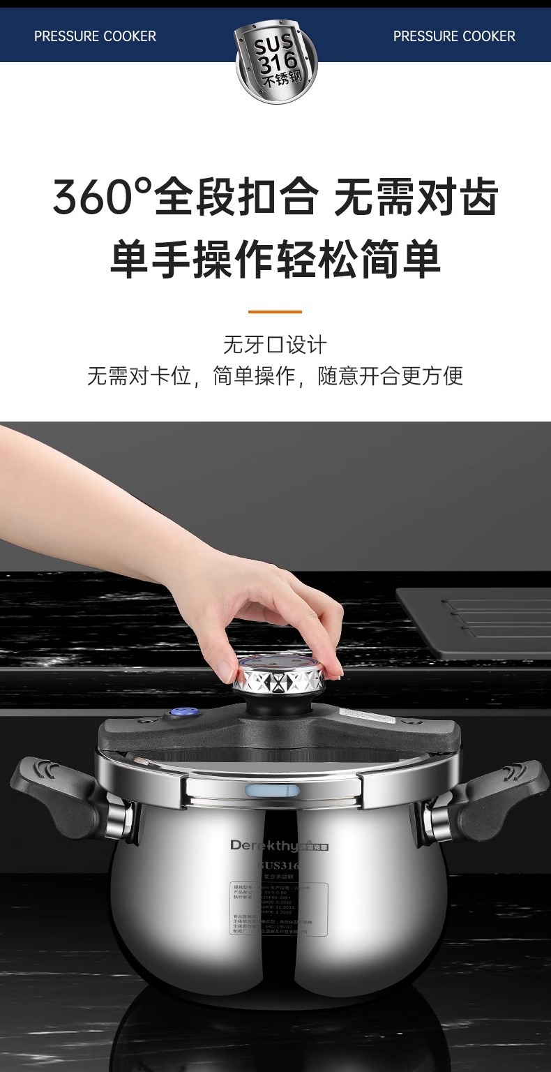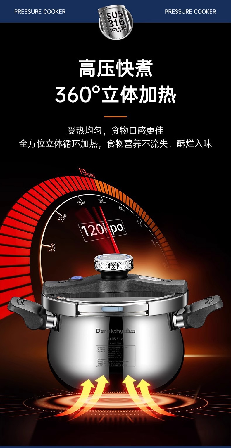 ドイツ製316ステンレス鋼高圧鍋、厚型防爆、家庭用ガス・電磁調理器対応、公式正規品新型圧力鍋