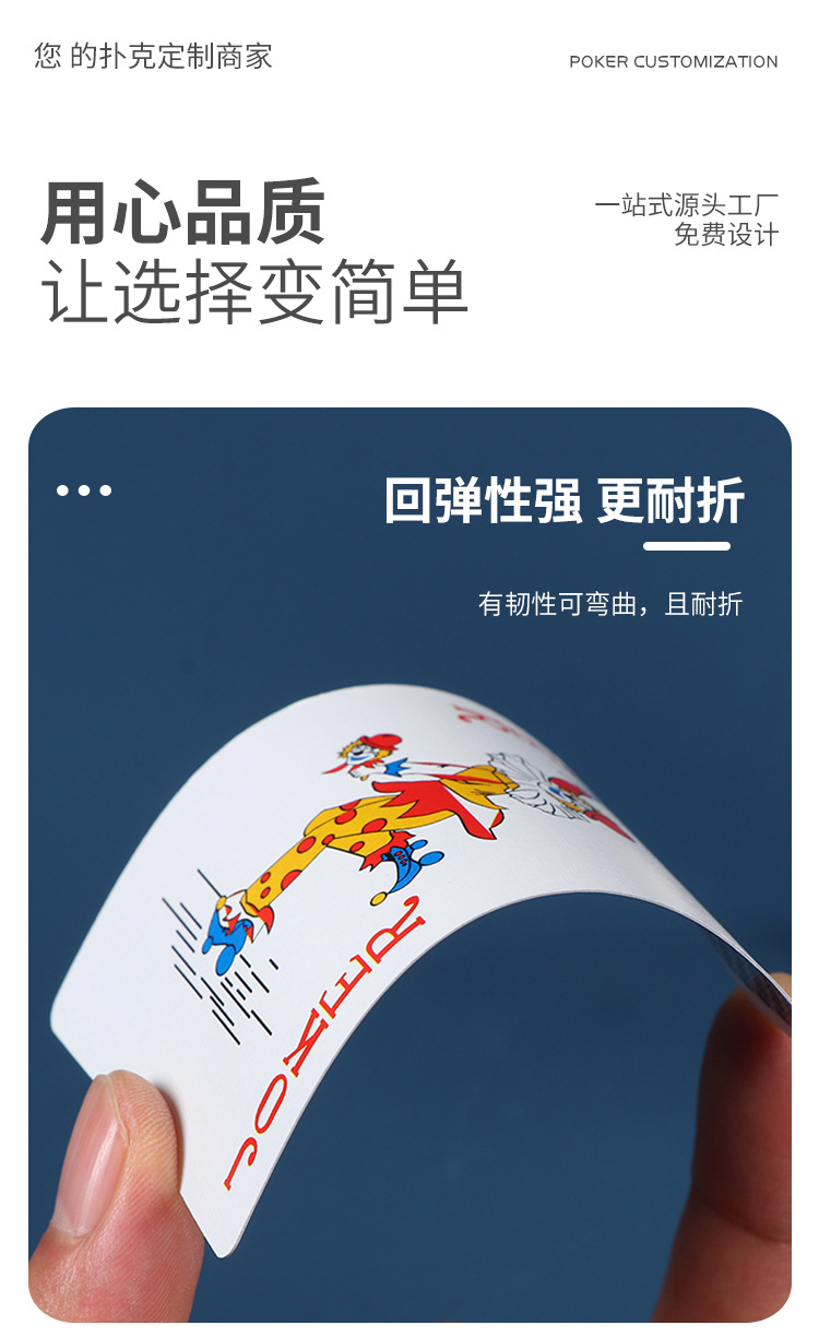 2.扑克牌的材质白度没有电脑设计图的白度白,且印刷模式为CMYK模式,电脑看图模式为RGB模式,整体印刷效果会比电脑偏暗偏灰,若客户有特殊要求,请在印刷定稿之前需要告知我们,可以付打样费打样后再定制批量货物。