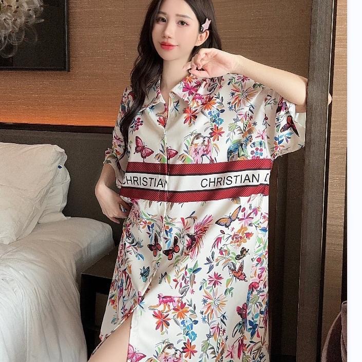 夏のパジャマの女性の高級感ファッションシャツの襟の氷のシルクのプリントのゆったりした中のスカートのカーディガンの部屋の服のパジャマの大きいサイズ