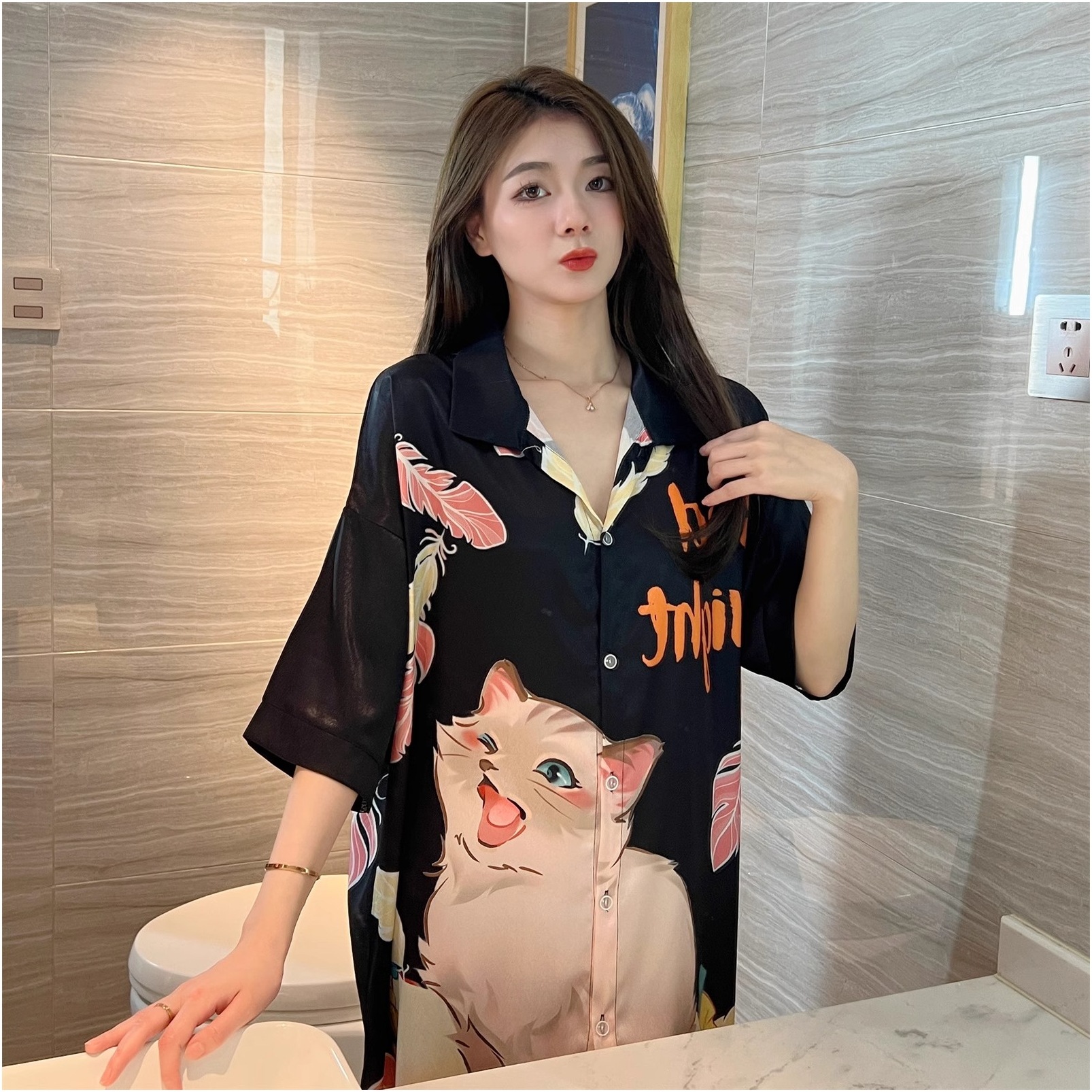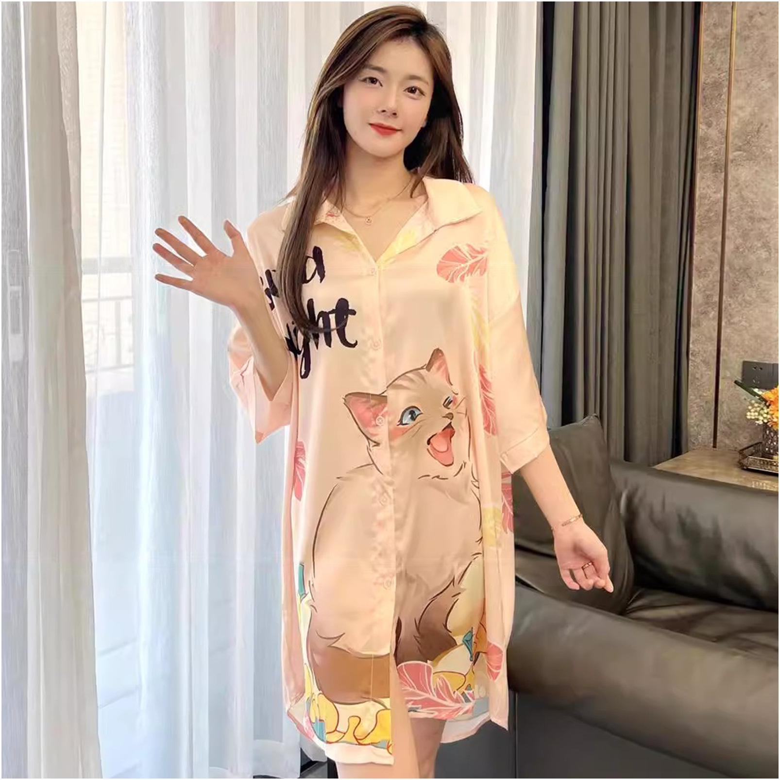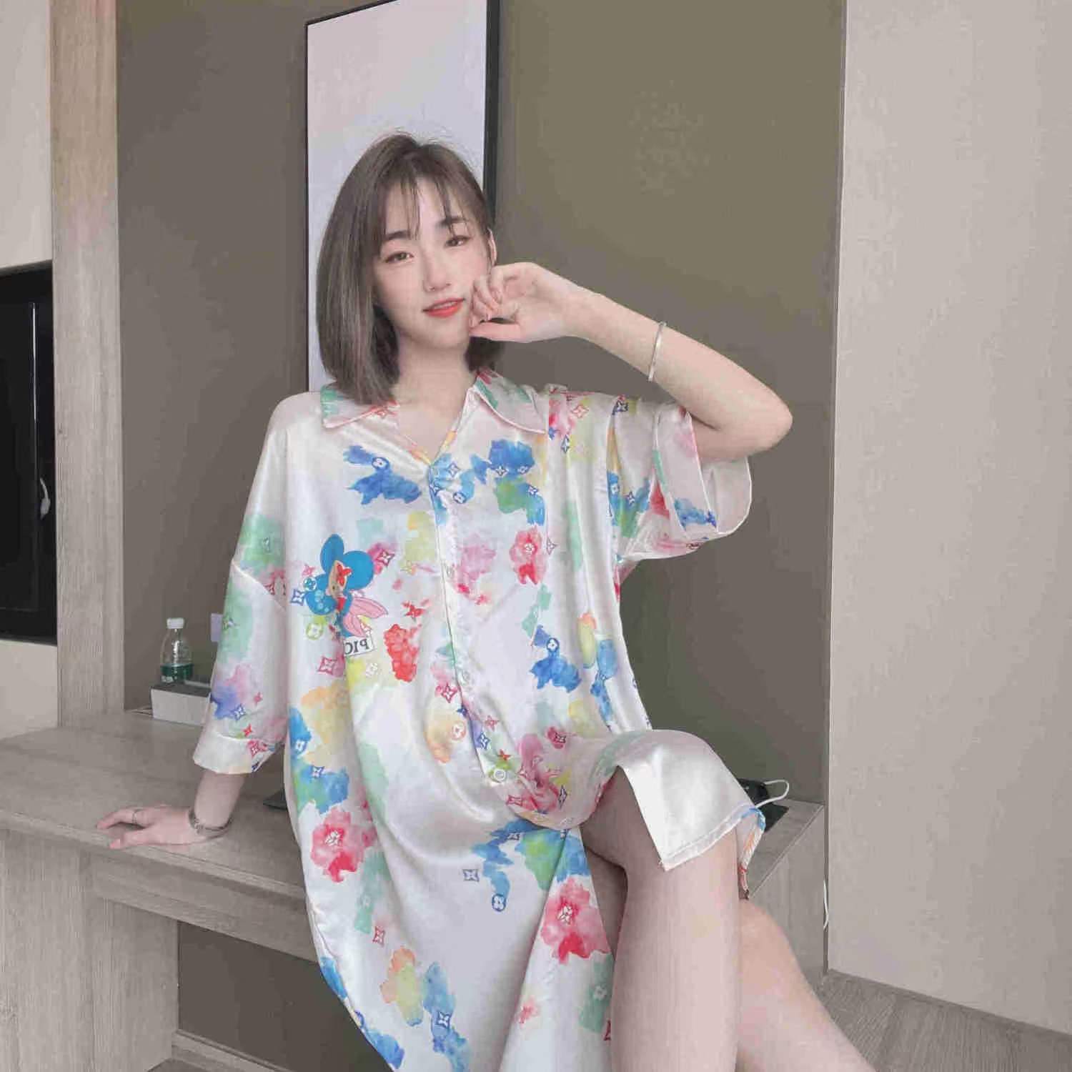 彼氏風パジャマ女性夏の薄い氷糸はシャツのスカートを着ることができます。