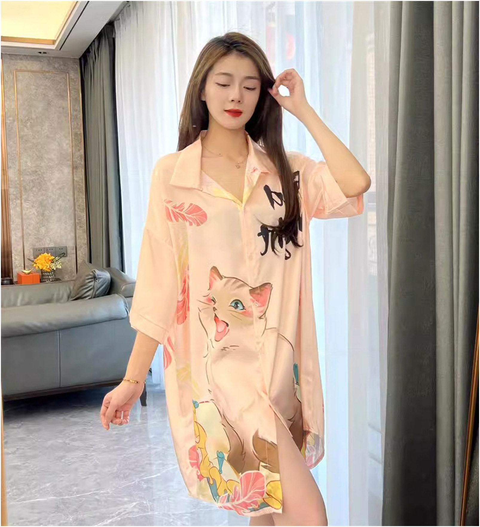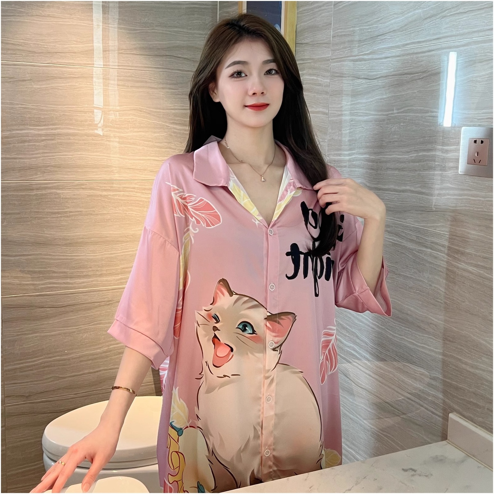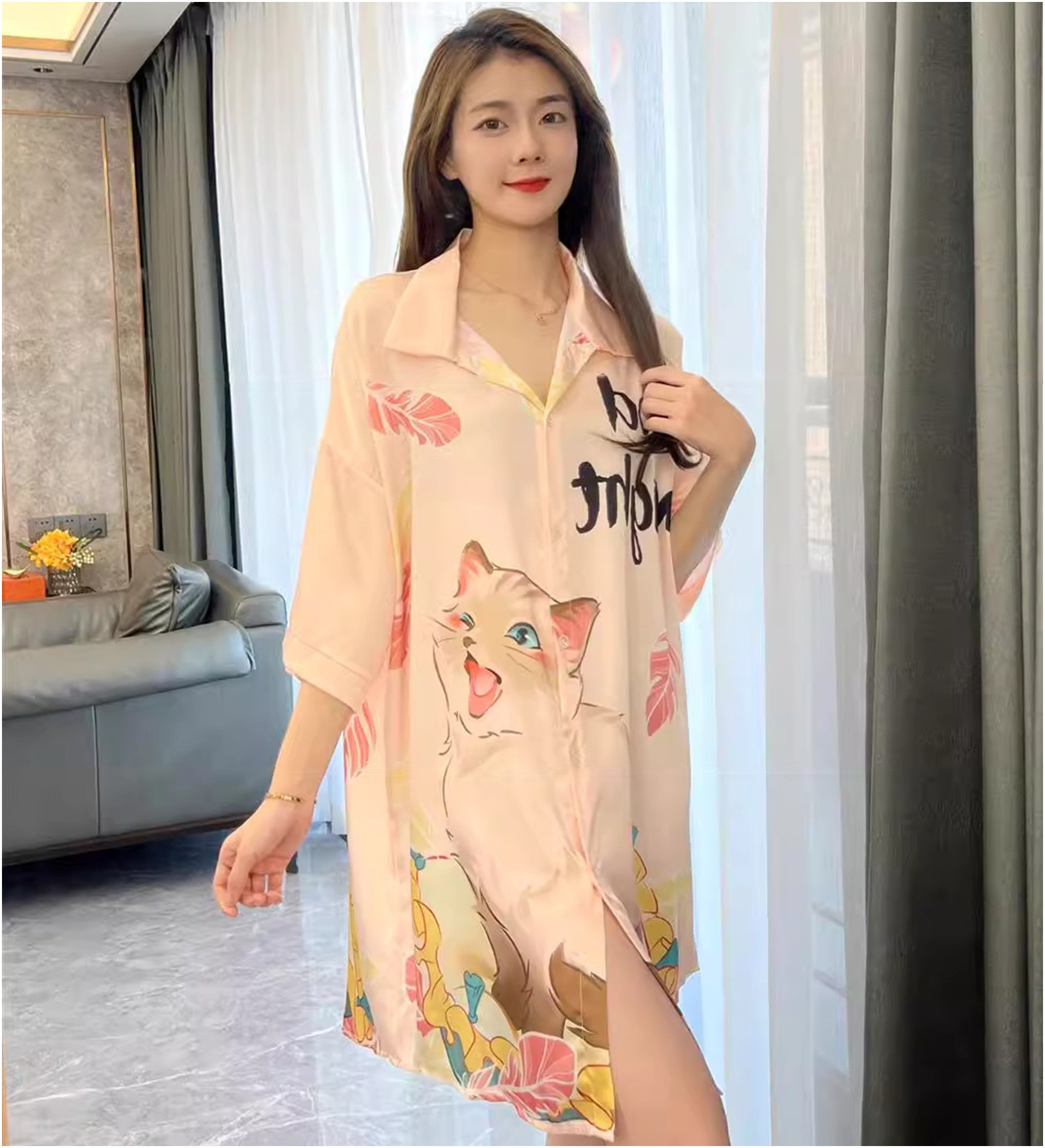 彼氏風パジャマ女性夏の薄い氷糸はシャツのスカートを着ることができます。