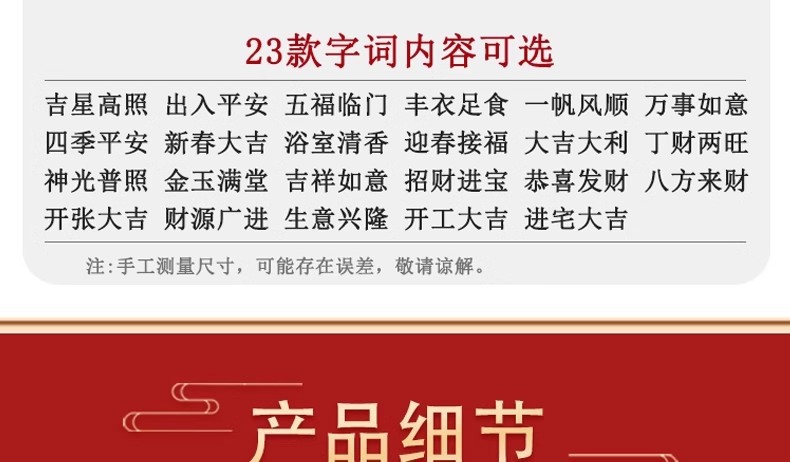 縁起の良い星 (52.3X21.5CM) ベルベットには裏面に粘着剤が付いています。,安全な出入り (52.3X21.5CM) ベルベットには粘着剤が付いています。,五つの祝福 (52.3X21.5CM) ベルベットには粘着性の裏地が付いています,順風満帆 (52.3X21.5CM) ベルベットには裏面に粘着剤が付いています,Bath Health (52.3X21.5CM) ベルベットには粘着剤が付いています。,キッチン Xingwang (52.3X21.5CM) ベルベットには裏面に粘着剤が付いています,十分な食事 (52.3X21.5CM) ベルベットには裏面に粘着剤が付いています。,すべてがうまくいきます (52.3X21.5CM) ベルベットには裏面に粘着剤が付いています,バスルームの香り (52.3X21.5CM) ベルベットには粘着剤が付いています。,四季平和 (52.3X21.5CM) ベルベットには裏面に粘着剤が付いています。,春節を迎えて祝福を受けましょう (52.3X21.5CM) ベルベットには粘着裏地が付いています。,新年開運 (52.3X21.5CM) ベルベットには裏面に粘着剤が付いています。,開運 (52.3X21.5CM) ベルベットには粘着剤が付いています。,Dongchengxi Ji (52.3X21.5CM) ベルベットには裏面に粘着剤が付いています,Dingcai Liangwang (52.3X21.5CM) ベルベットには裏面に粘着剤が付いています,Jixiang Ruyi (52.3X21.5CM) ベルベットには粘着性の裏地が付いています。,Jinyu Mantang (52.3X21.5CM) ベルベットには粘着性の裏地が付いています,Shenguang Puhua (52.3X21.5CM) ベルベットには裏面に粘着剤が付いています。,家に入る幸運 (52.3X21.5CM) ベルベットには裏面に粘着剤が付いています。,ビジネスは好調です (52.3X21.5CM) ベルベットには裏面に粘着剤が付いています,開運 (52.3X21.5CM) ベルベットには裏面に粘着剤が付いています,Bafanglaicai (52.3X21.5CM) ベルベットには粘着性の裏地が付いています。,ラッキー (52.3X21.5CM) ベルベットには裏面に粘着剤が付いています。,Gong Xi Fa Cai (52.3X21.5CM) ベルベットには粘着裏地が付いています。,Caiyuan Guangjin (52.3X21.5CM) ベルベットには粘着性の裏地が付いています。,頑張ってください (52.3X21.5CM) ベルベットには裏面に粘着剤が付いています