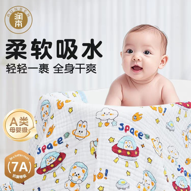润本棉纱浴巾婴幼儿童a类母婴级六层盖毯包被全棉洗澡巾纱布浴巾