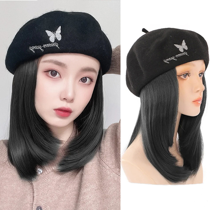 ウィッグと帽子一体型ベレー帽レイジースタイル模擬人毛ショートカーリーヘアスクリューカーリースタイルママヘアブラック