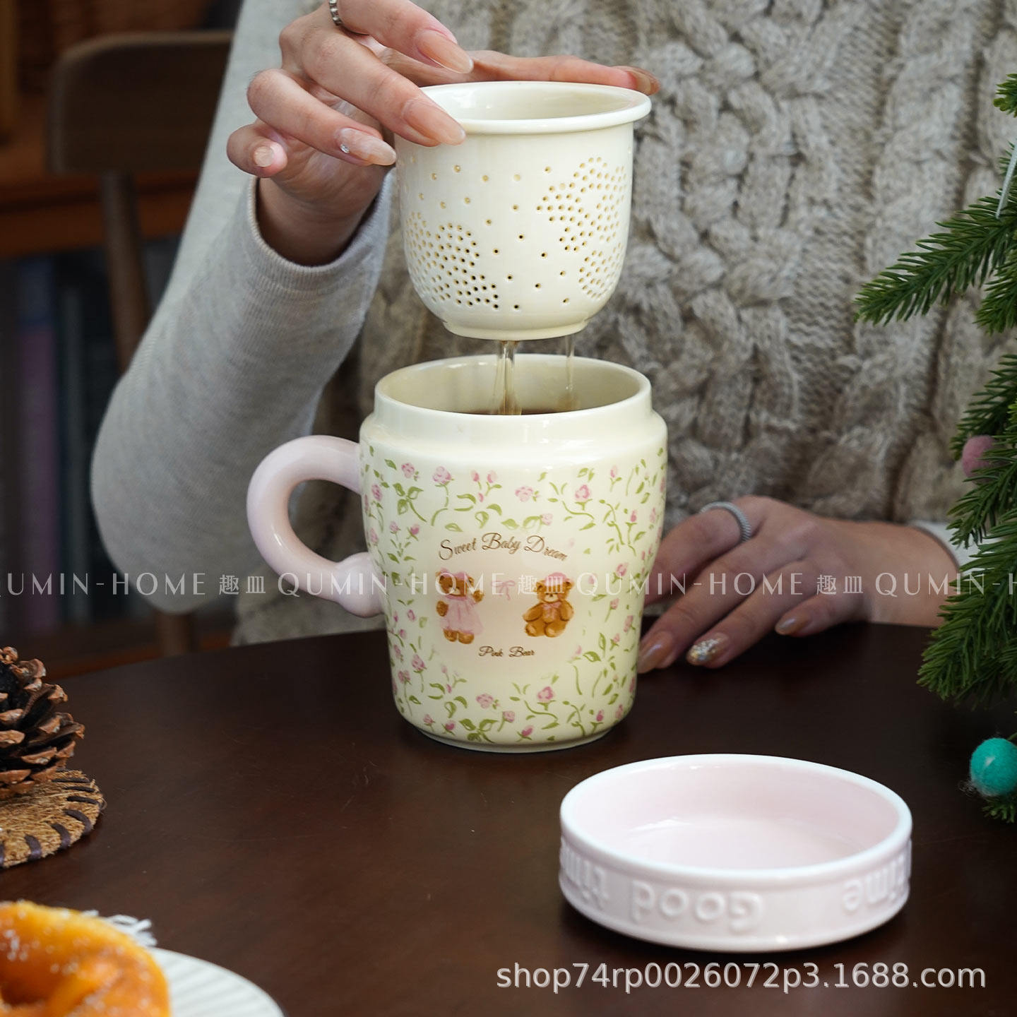 创意可爱陶瓷泡茶杯办公室茶水分离卡通带茶格握柄杯马克杯子白瓷
