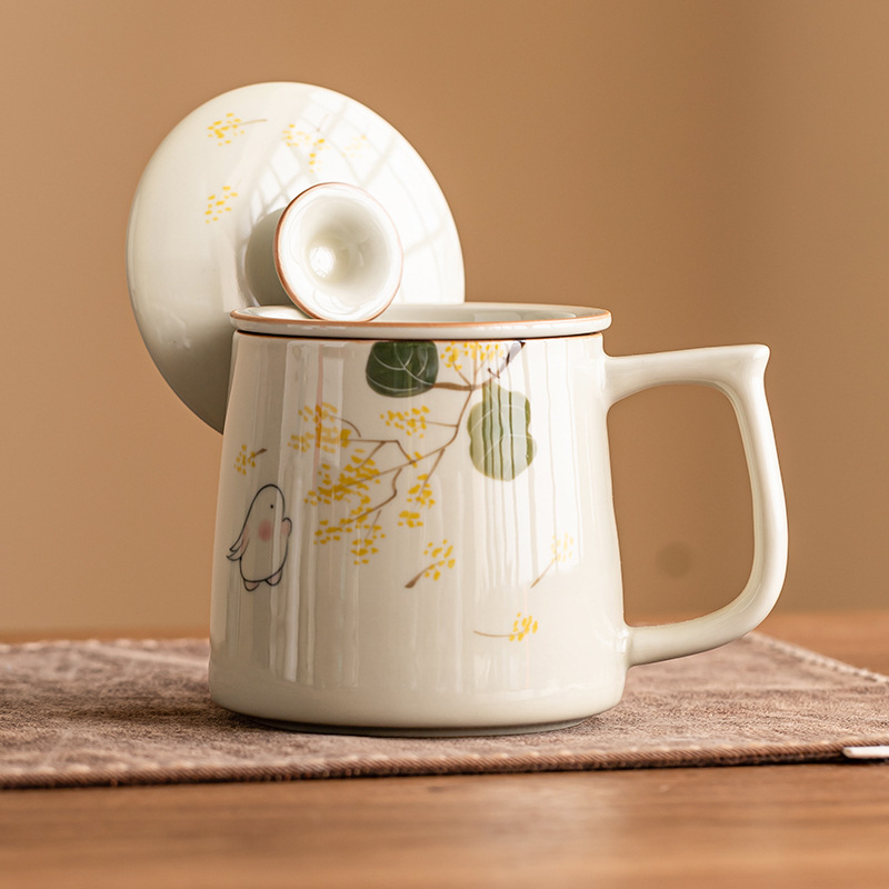 純手描き金桂月兎泡茶杯茶水分離ろ過内胆事務杯陶磁器杯マグカップ蓋付き