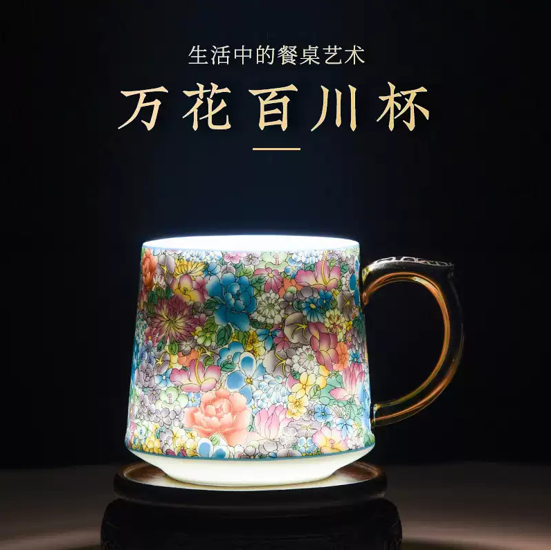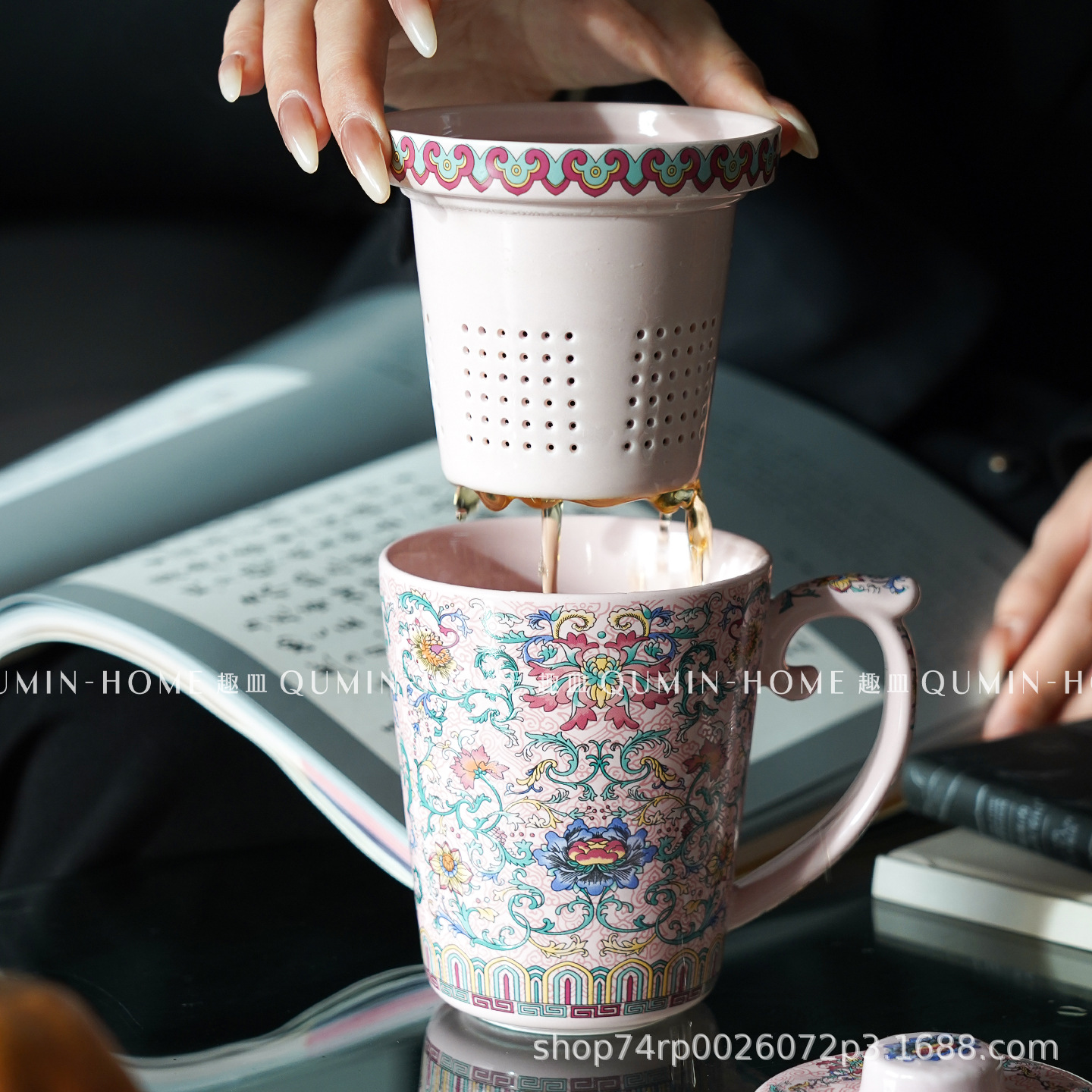 景德镇珐琅彩陶瓷茶杯茶水分离杯子家用大容量喝茶杯中式带盖茶漏