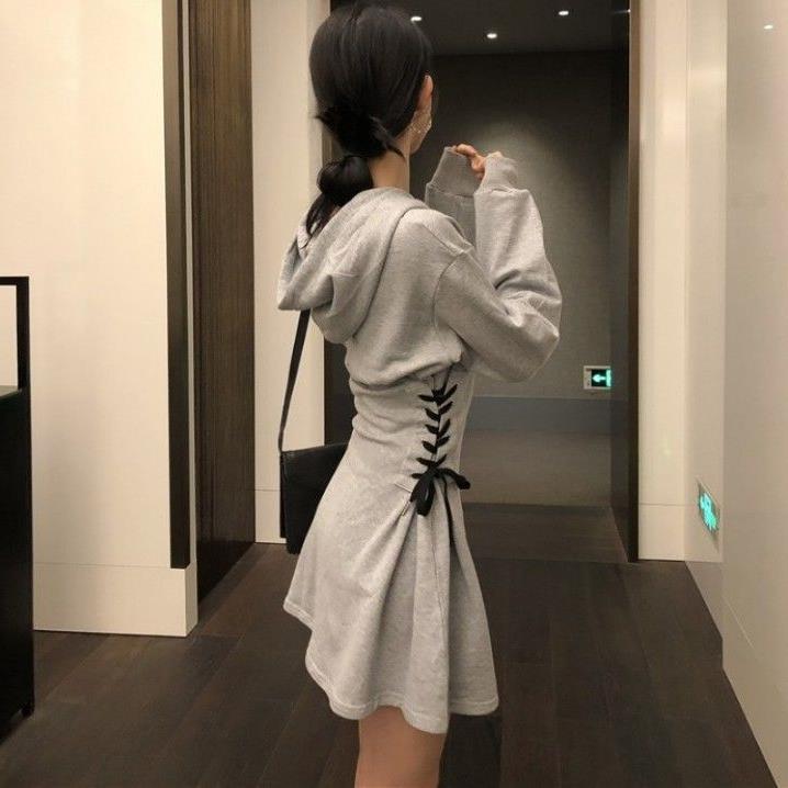 春と秋の新型韓国版港味ファッションサイドバンド長袖デザイン感ウエストフード付きのワンピース女性