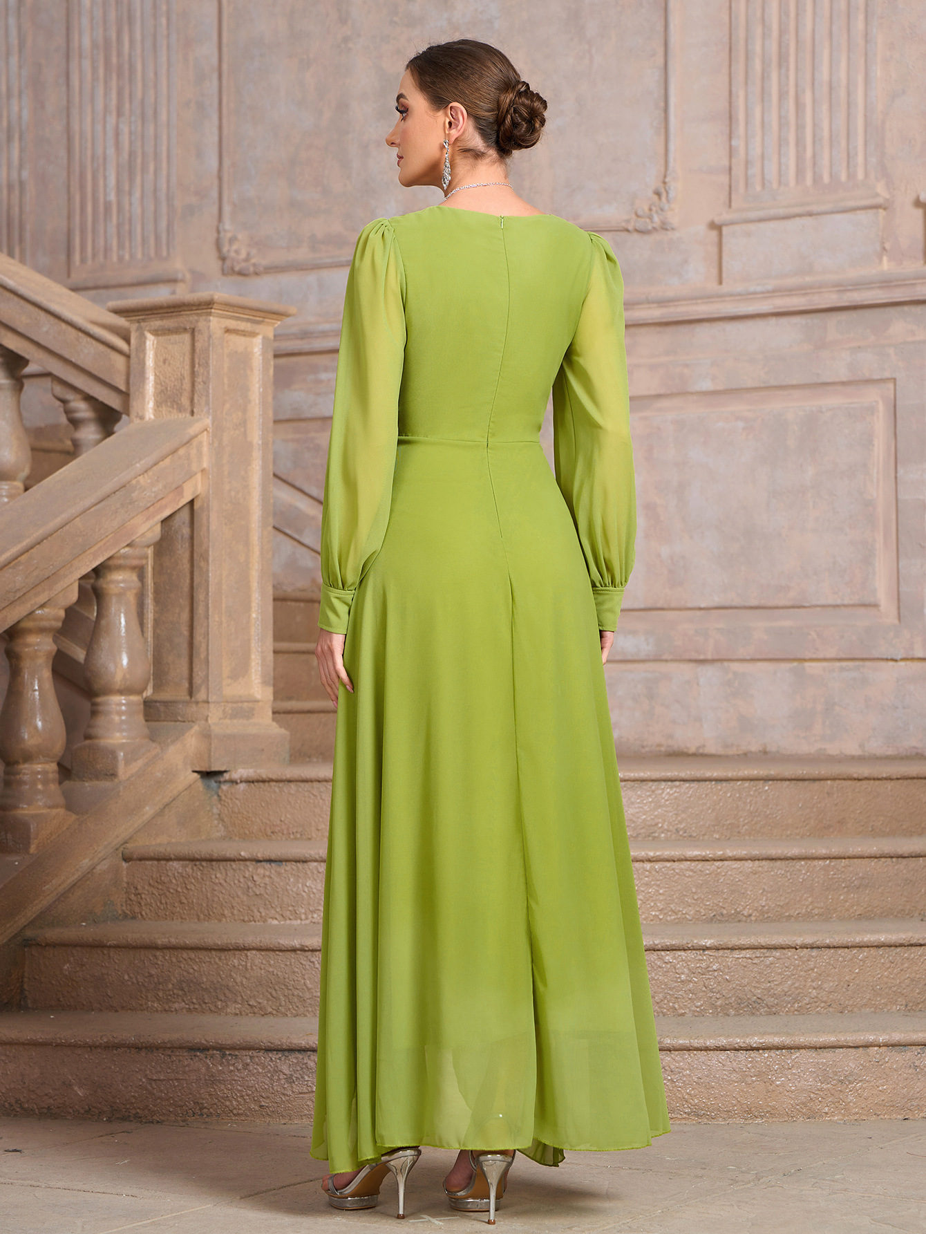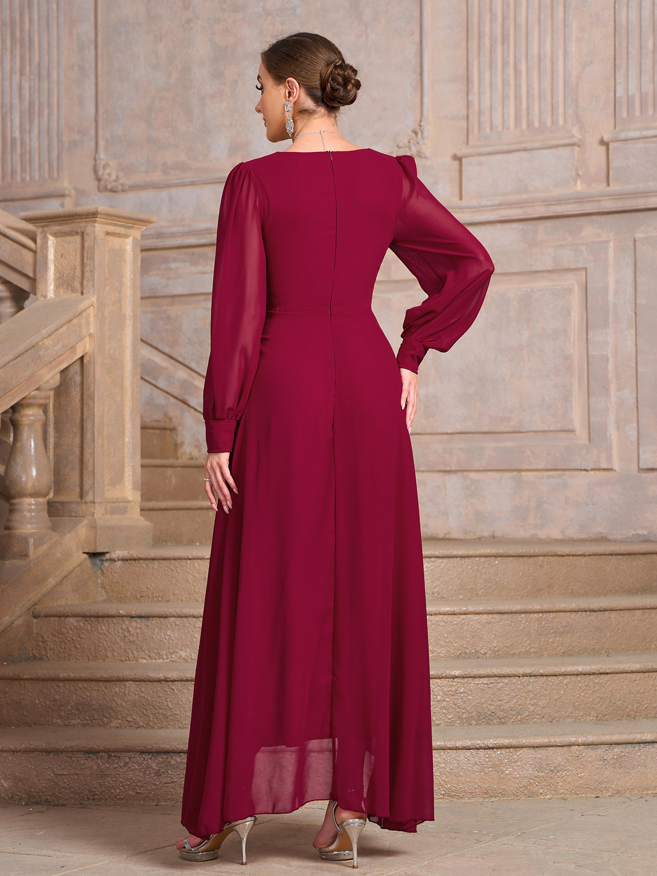 ラウンドネック長袖スパンコール装飾サテン生地ロング丈ドレス、イブニングドレス、プロムドレス、無地ドレス(女性用)