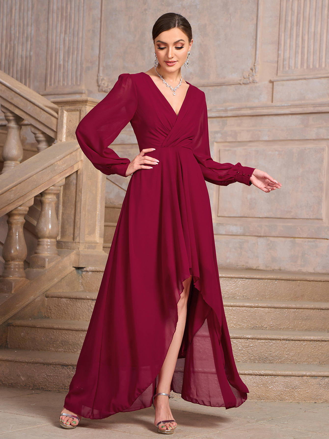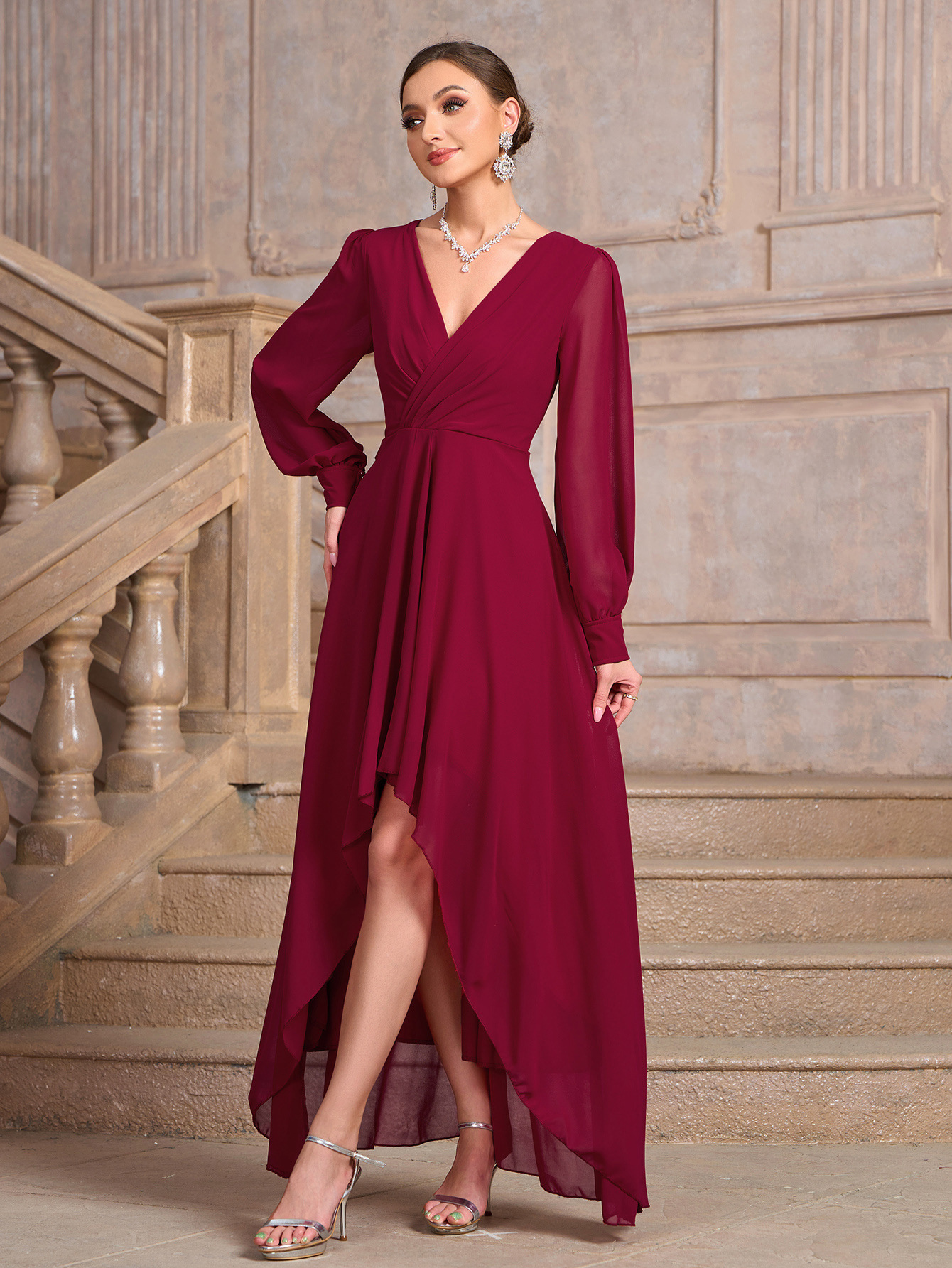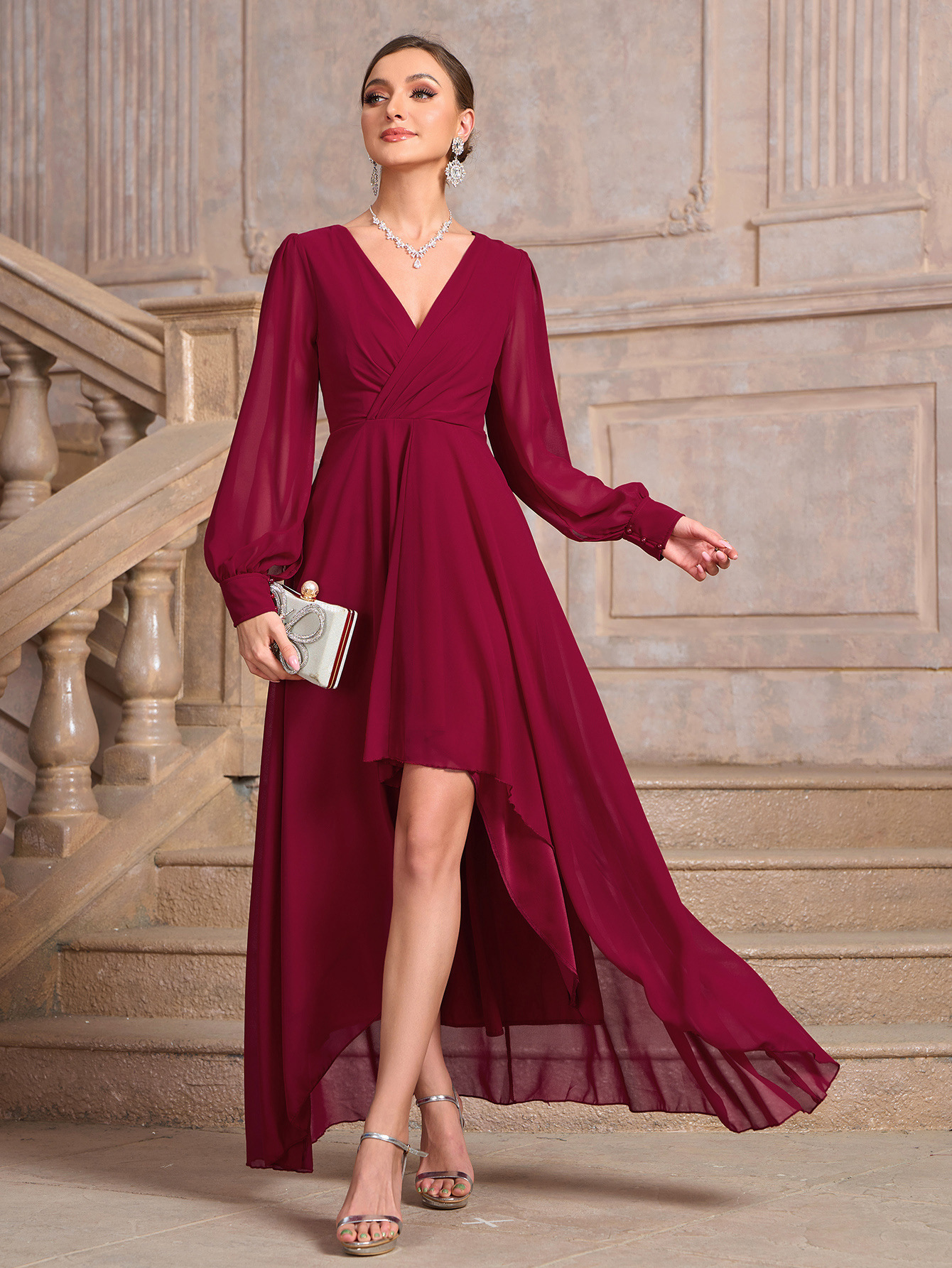 25 春夏手作りフォールドスイングダブル V ネックフレアスリーブドレス弾性シフォン宴会花嫁介添人プラスサイズのイブニングドレス
