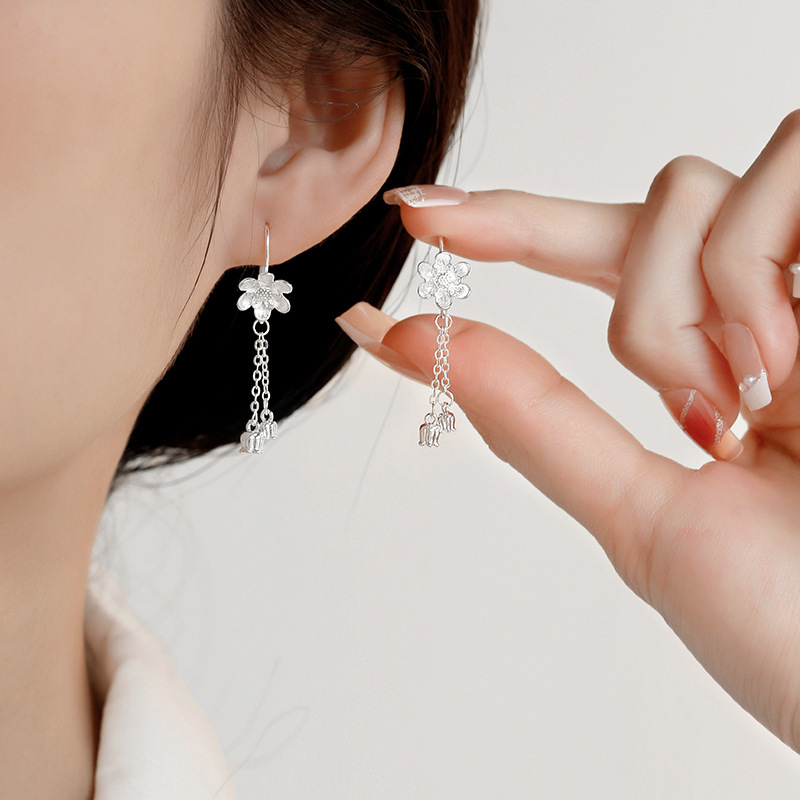 S999純銀椿の花タッセルロングイヤリング レディース 個性的デザイン 高級感 軽やかなラグジュアリーイヤリング 秋冬イヤリング