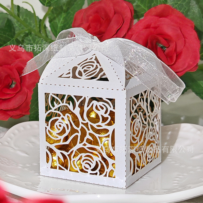 国境を越えたレーザー透かし彫りのバラの喜糖箱ヨーロッパ風模様の結婚祝いのお土産箱リボンのキャンディー箱