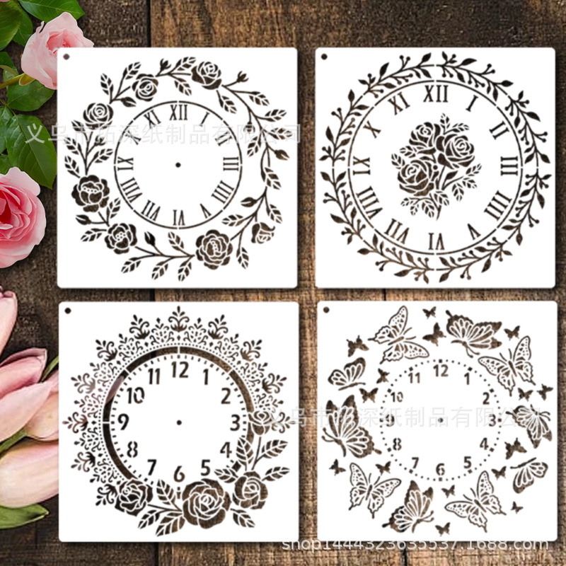 跨境玫瑰花卉时钟镂空绘画模板 客厅DIY装饰钟表手工辅助用品