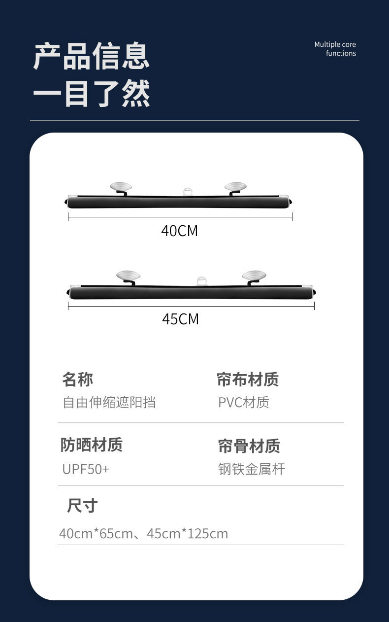【产品特点】:该产品独具高效隔热,自动收卷,安装方便,不伤车体,实用性强等优点.本品为一只装;使用在侧窗时候,每个窗用一只。每只配备3个吸盘。使用在后窗时候,可以两只同时用在后窗。简约使用,美观大方。吸盘质量是全新的材料制造,吸力比较不错的哦!您可以随意横着吸或竖着吸哦!都是可以的哦!(不过朋友们要先把自己爱车的尺寸确认好在买哦