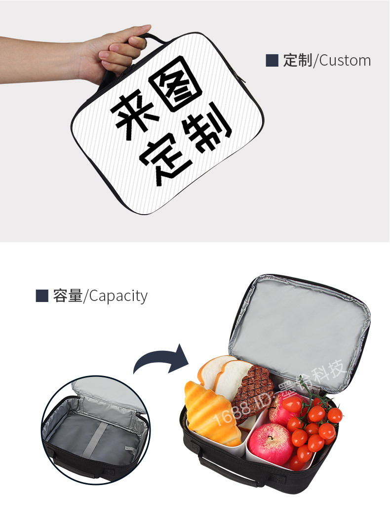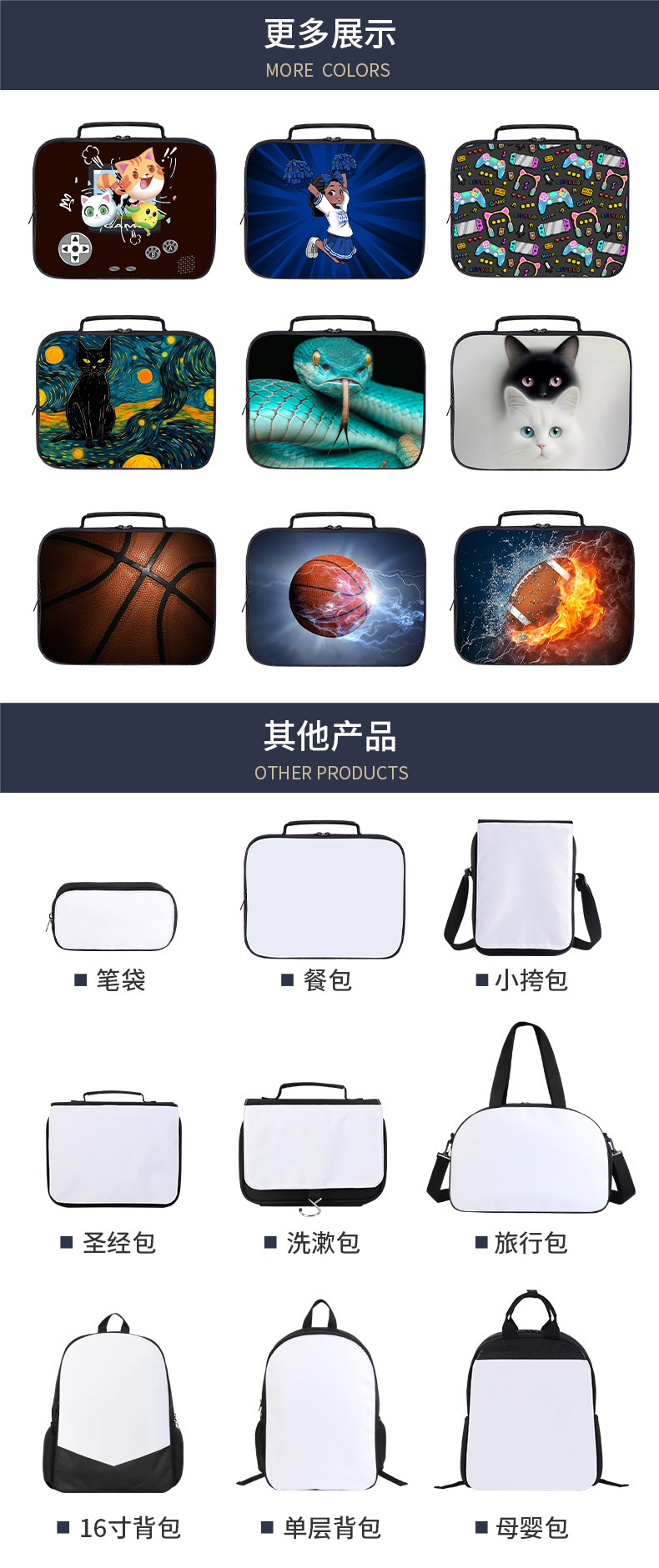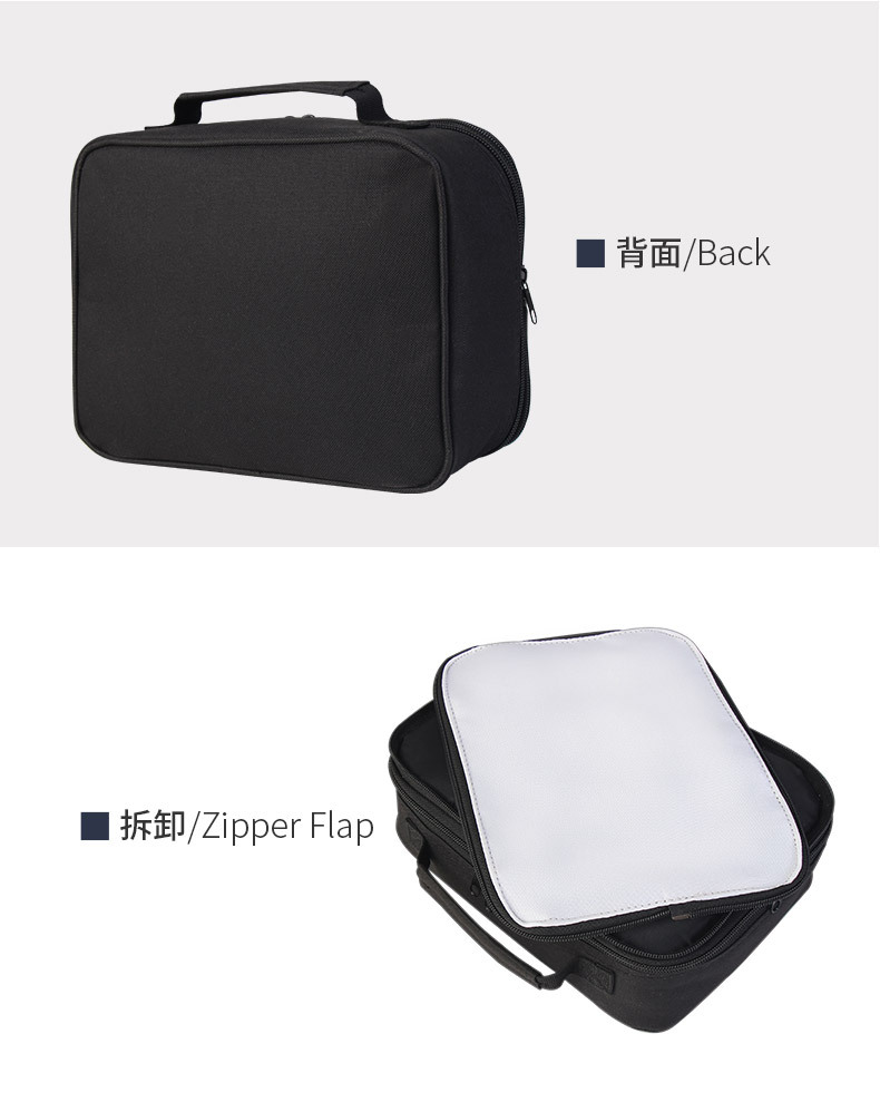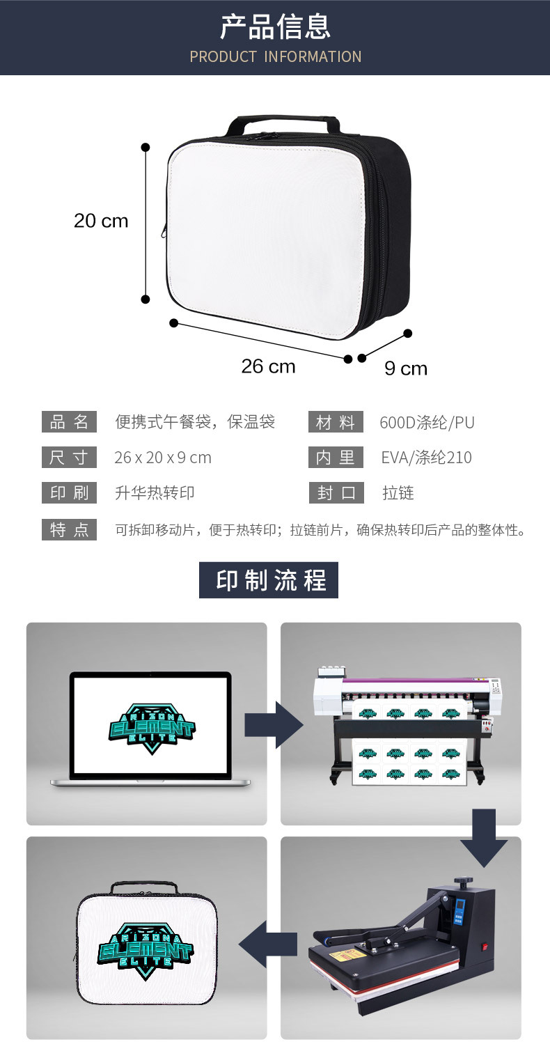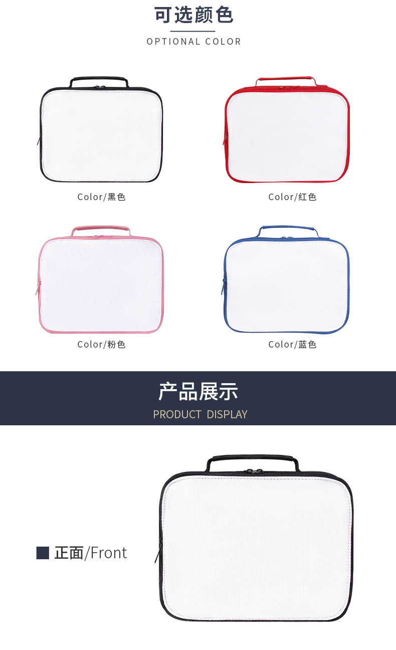 1. 产品简介:福建泉州实力厂家,空白手提餐包,加厚保温内部采用PEVA环保内衬,一成型工艺,底部带汤勺固定松紧带,独特可拆卸拉链移动片,拉链与移动片采用特殊材质除热转印外可DIY刺绣 绘画 烫画更多创意等您解锁.4色可选:黑色、红色、蓝色、粉色。(空白前片可自由拆卸方便自行印花)
