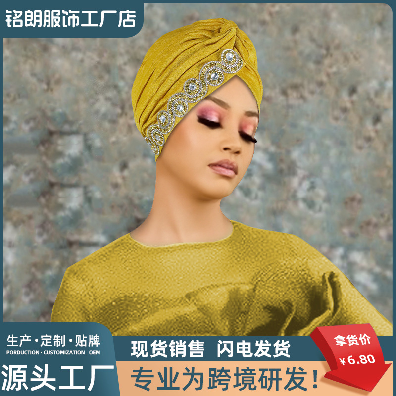 Amazonスポットファッションホットダイヤモンドクリスタル麻レディースターバンハットイスラム教徒無地ボトムハット包頭帽子