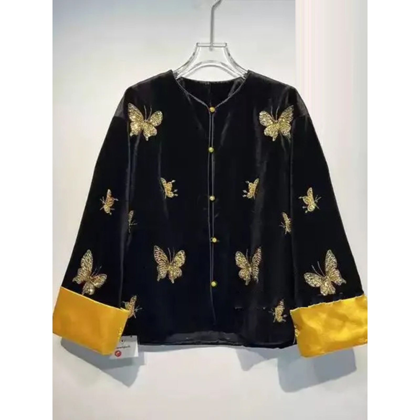 大きいサイズの婦人服の新しい中国式の復古の国風はシルクの刺繍の蝶々をまねて綿のショートコートを挟みます。