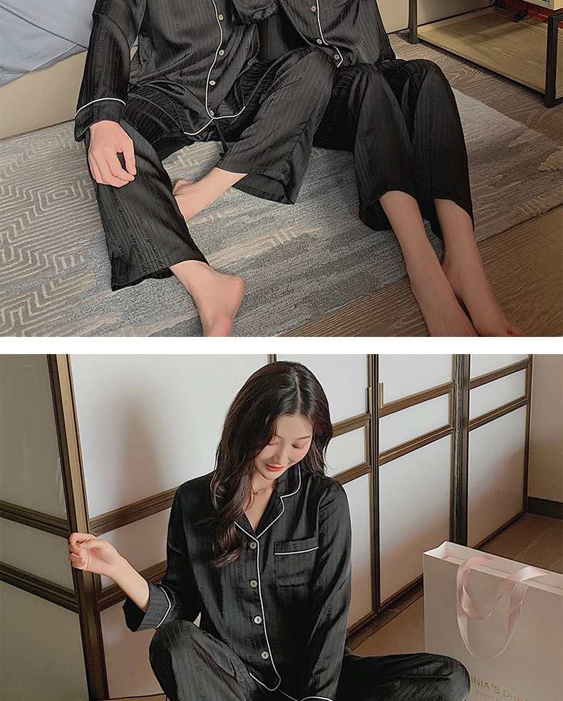 桑蚕丝情侣睡衣女两件套春秋季长袖长裤宽松套装纯色真丝家居服男