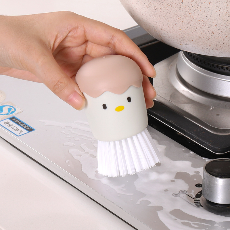 漫画の卵の殻のニワトリは取っ手のppのブラシを持って鍋を落として台の上のブラシの卵の殻の台をこすります。