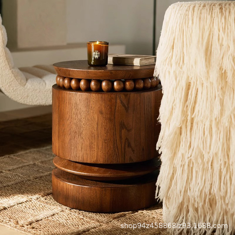 フランス風無垢材円柱型ティーテーブル、小型サイドテーブル、アンティーク調デザインのスツール、丸型スツール、レトロな木製新作ティーテーブル