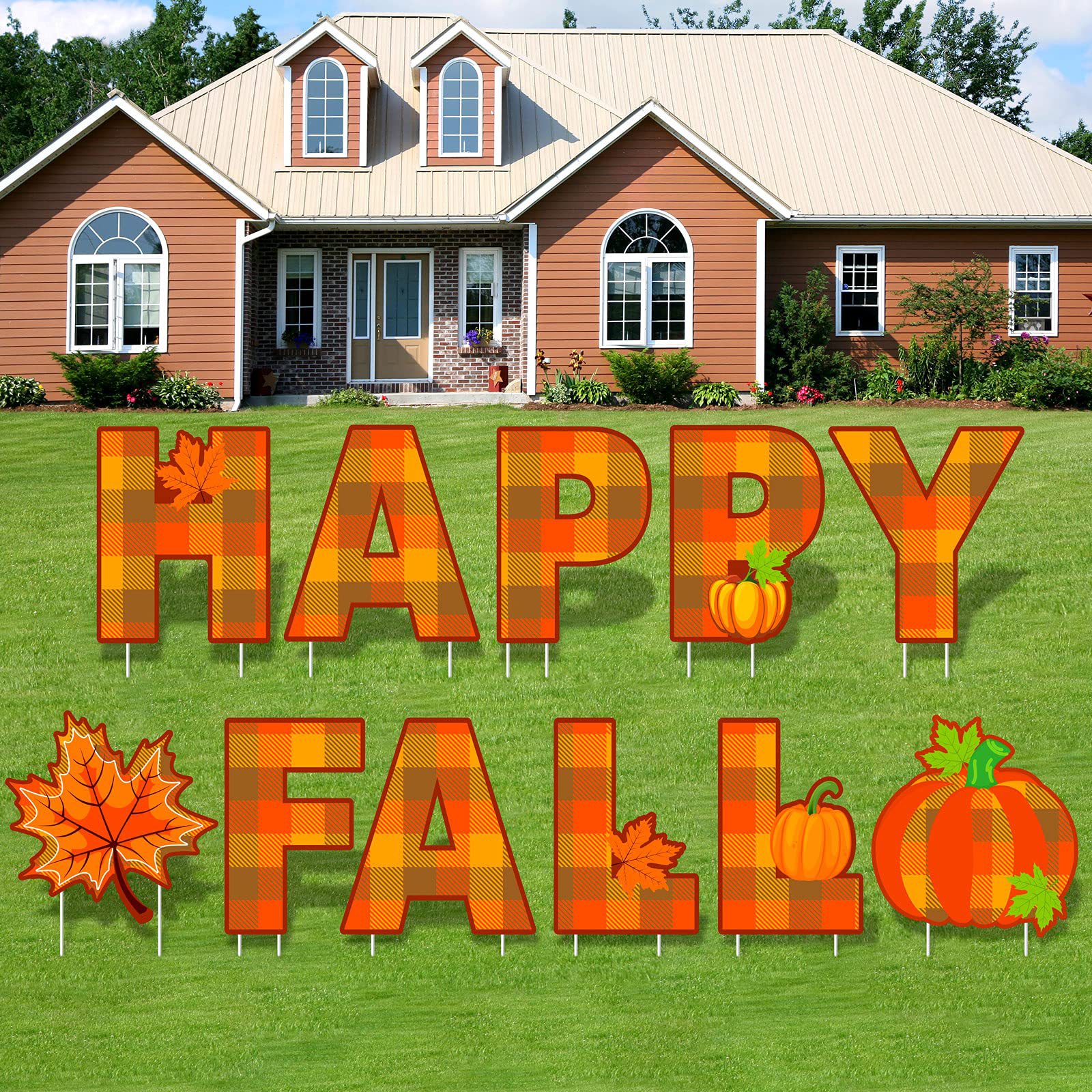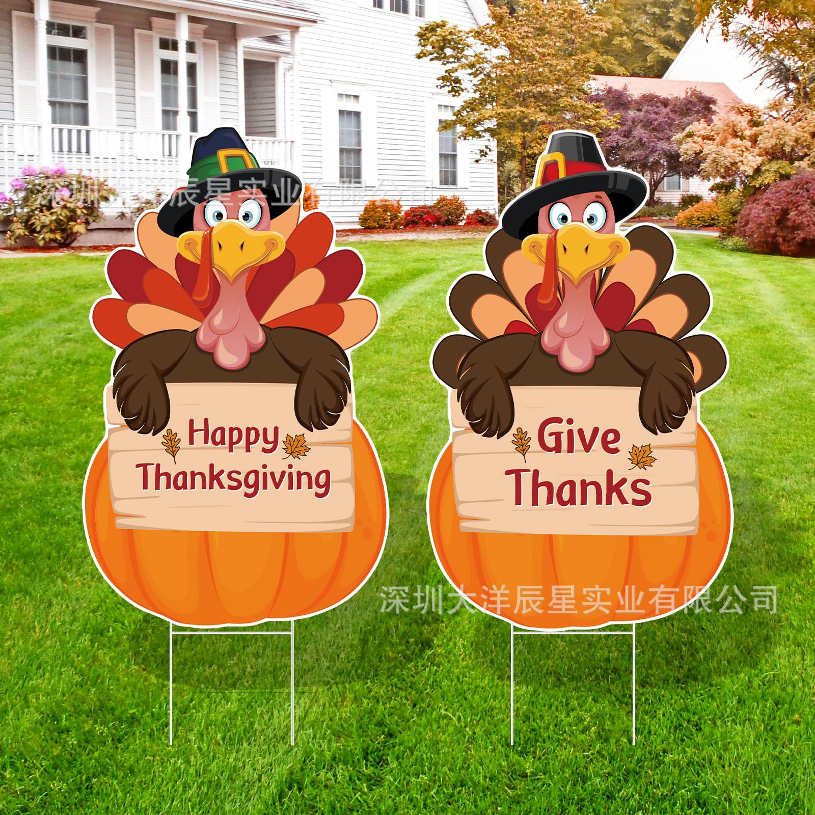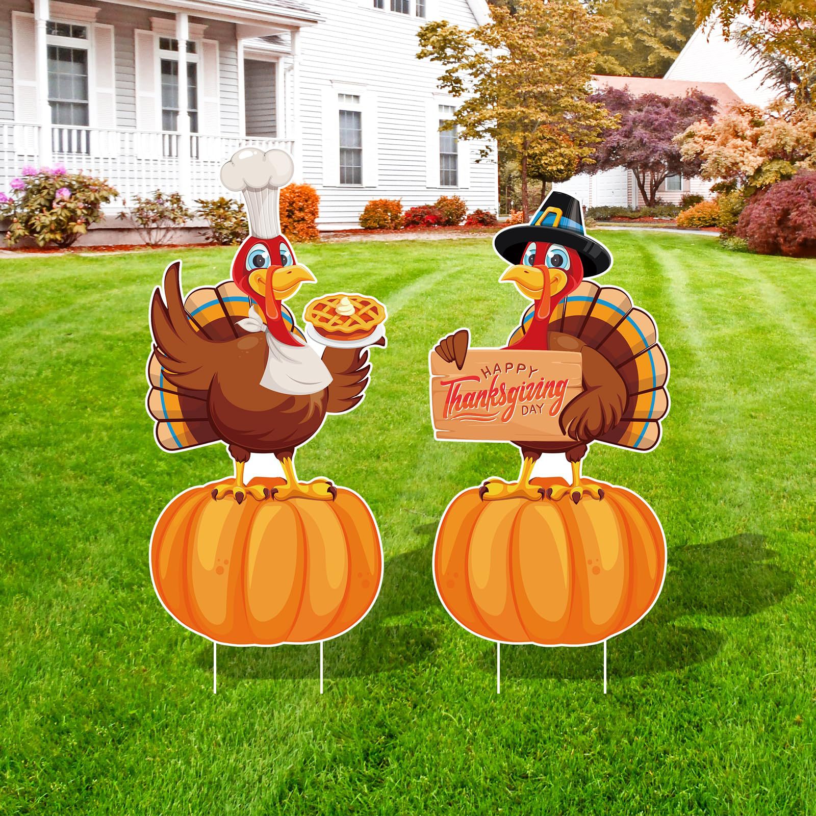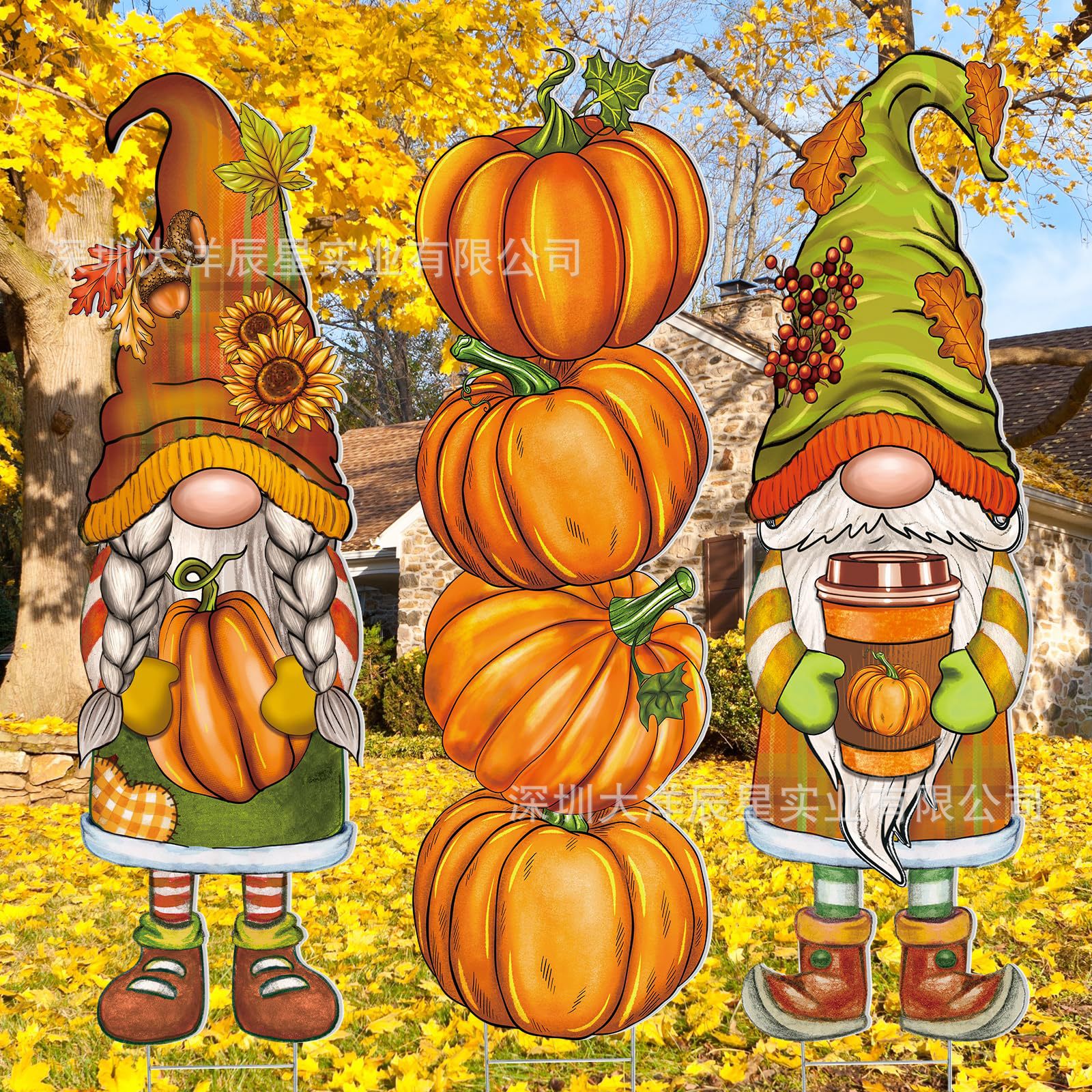 感謝祭の庭には芝生の楓の木のリスの七面鳥の小人のカボチャの感謝祭の屋外の装飾の看板があります。
