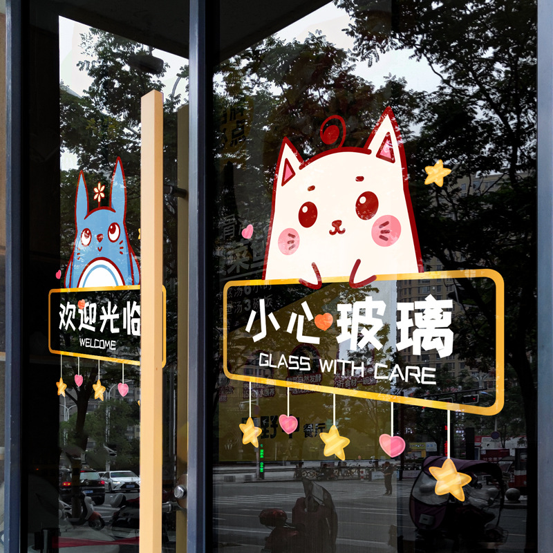 気をつけてガラスシール店のショーウインドーガラス扉装飾アニメ暖かいヒント衝突防止静電シール卸売り代発