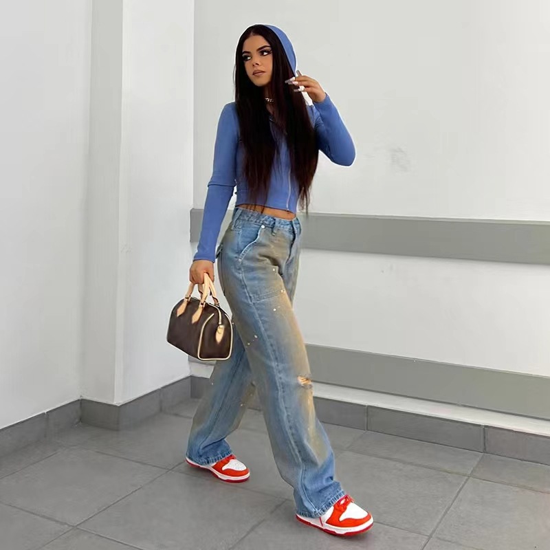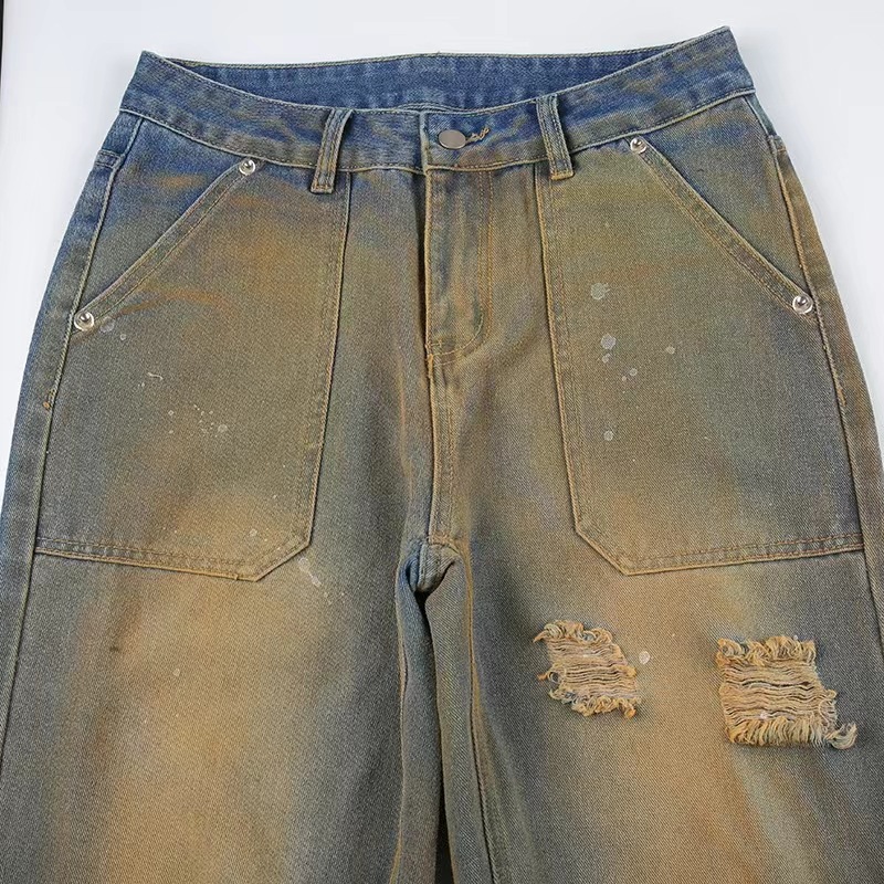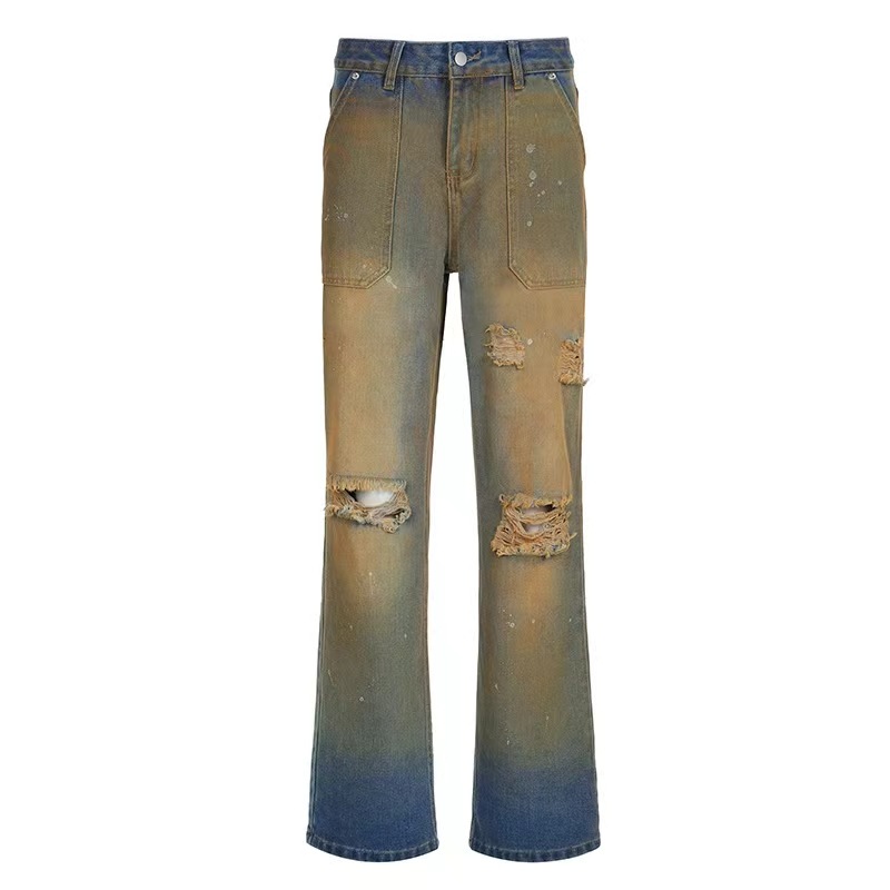 欧米のレトロな個性のホットドリルは古いゆったりとした広脚の低い腰のジーパンの2024春夏の新型のファッションのカジュアルなズボンをします。