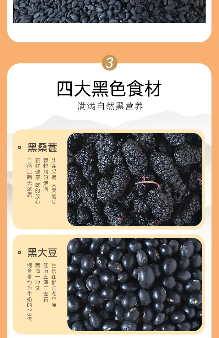 原材料と成分 黒ごま、黒豆、黒米、桑の実、黒キヌア、オーツ麦、氷砂糖粉末、くるみ粒、食用ブドウ糖