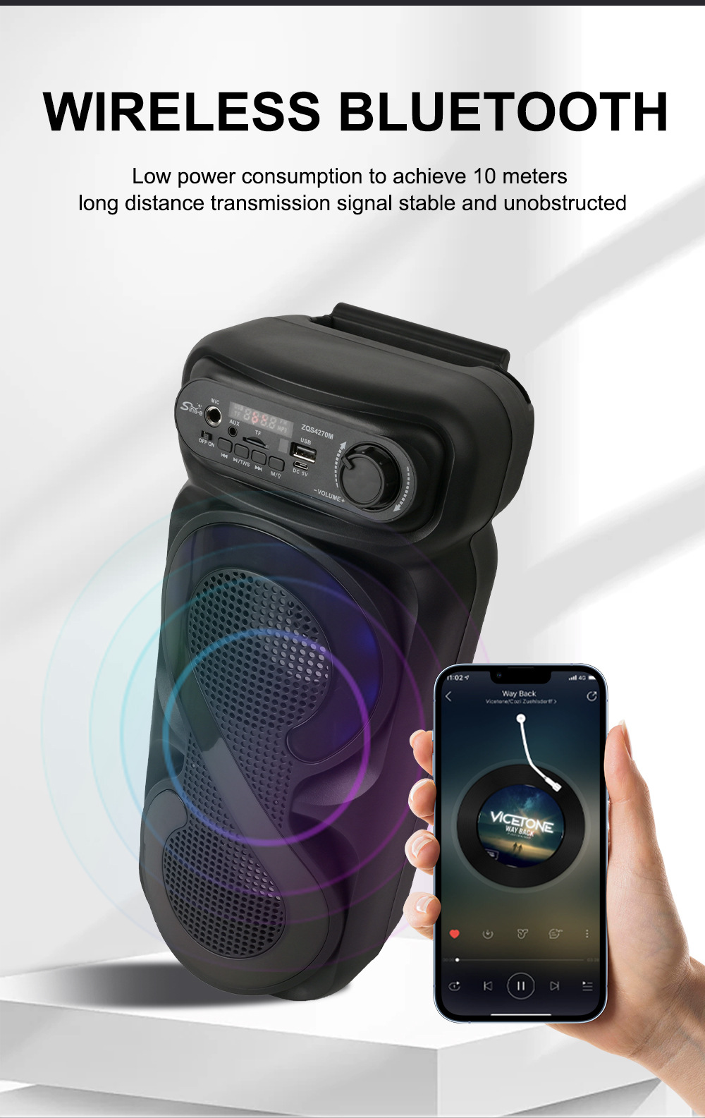 带蓝牙/带收音/带遥控(接收头装主板)/电位器音量,带USB/TF卡/MIC、DC-5V充电/带AUX(带3.5音频座)双功放,假双声道/带锂电保护,带显示屏/USB不升压、对箱功能,带幻彩灯+七彩灯、幻彩灯+七彩灯都受MOD控制