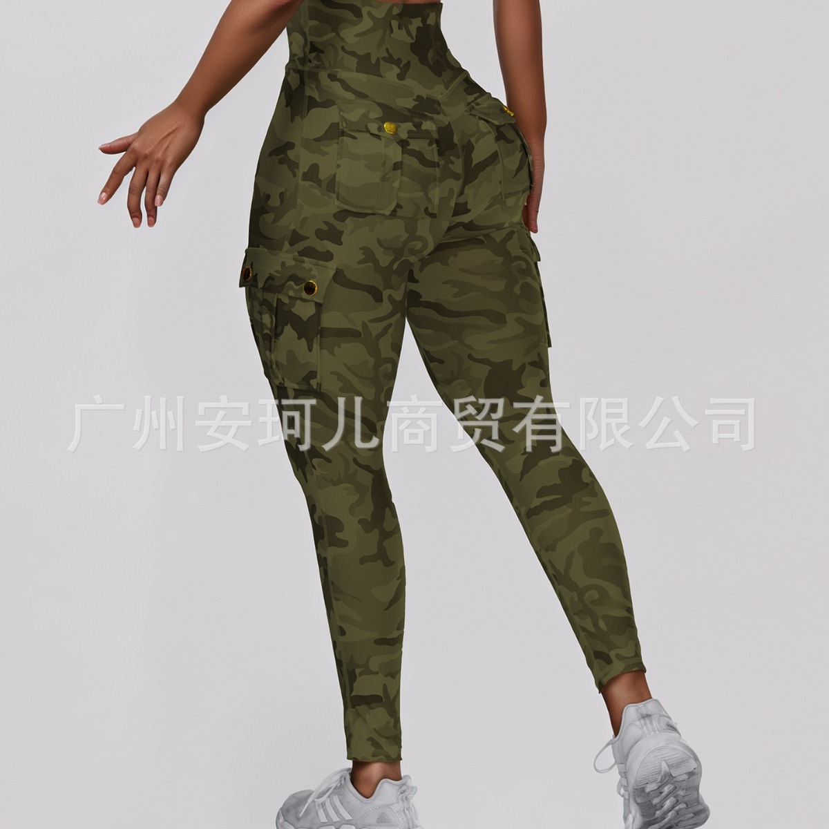 現物錦両面迷彩欧米ポケット工装フィットネスパンツ女性高弾ガードル速乾ランニング9分