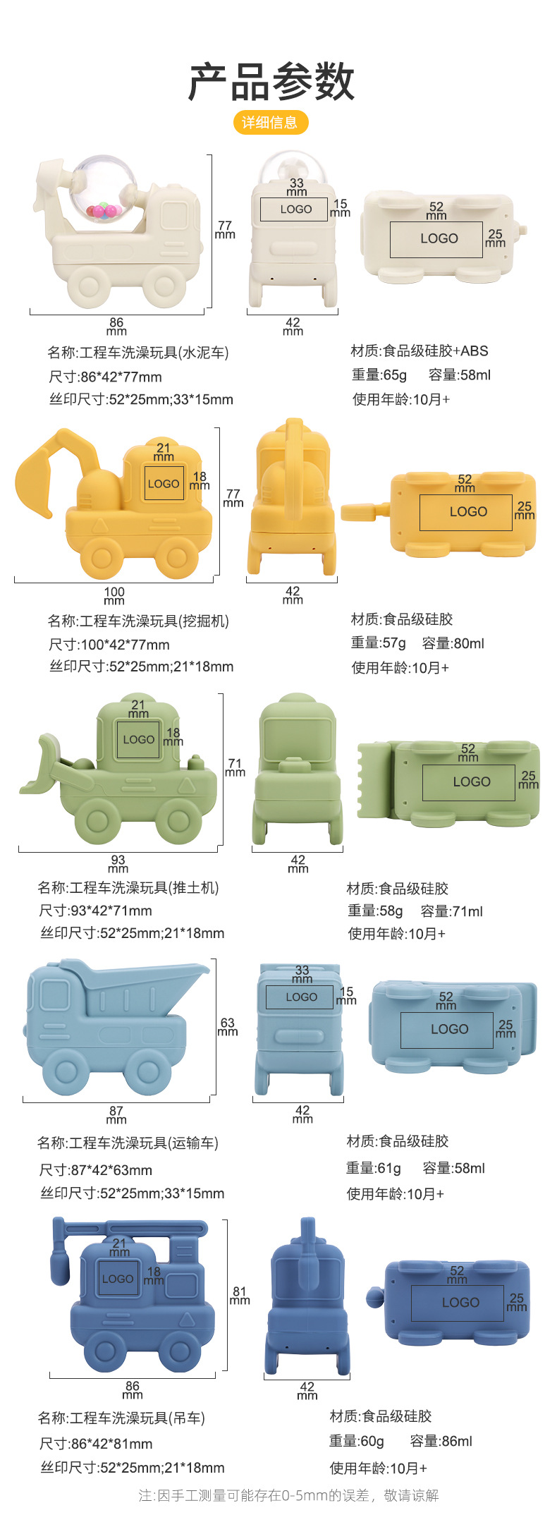 カラー ショベル-楚黄色,輸送車-ネオンブルー,ブルドーザー-バブルグリーン,クレーン-染めブルー,セメント車-ストーンホワイト,5個セット