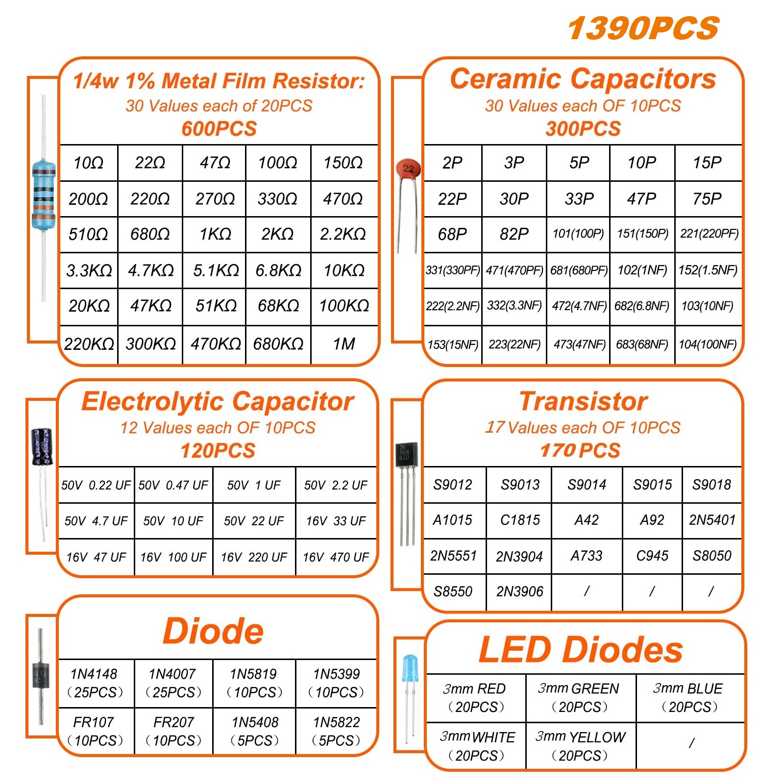 1390PCS 6種類のコンポーネントパッケージ抵抗パッケージ電解コンデンサパッケージLED発光二三極管磁器チップコンデンサパッケージ