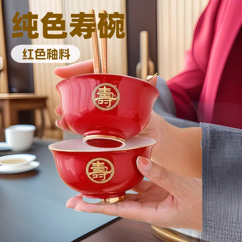 卸売誕生日金寿ボウル、長寿と長寿、金縁の赤い釉薬、新築祝いの赤い釉薬ギフト、金寿ボウル