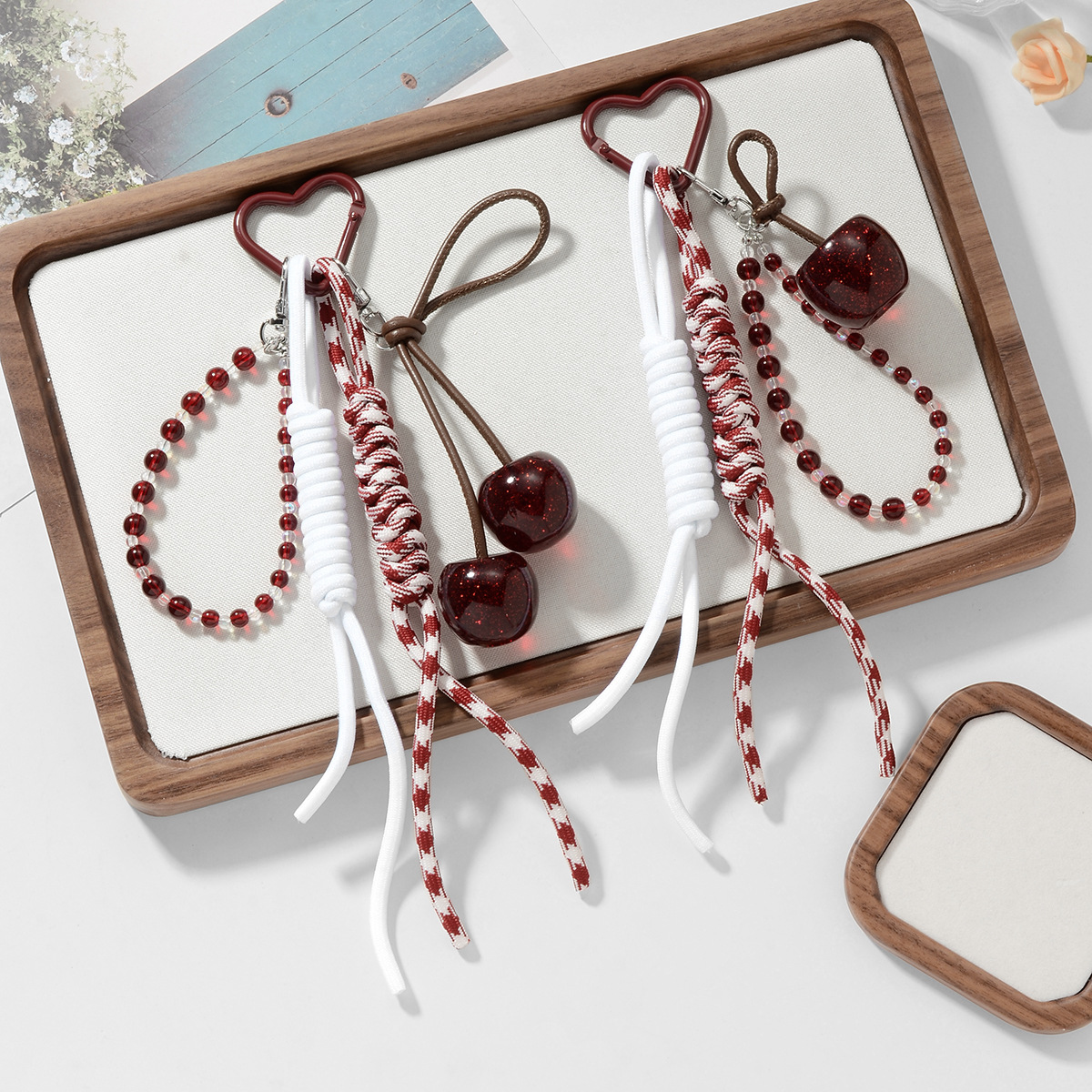 新しいミュウスタイルの絶妙で甘くて多用途な赤いビーズの細かい光沢のある模擬チェリーアップル編みロープキーホルダー